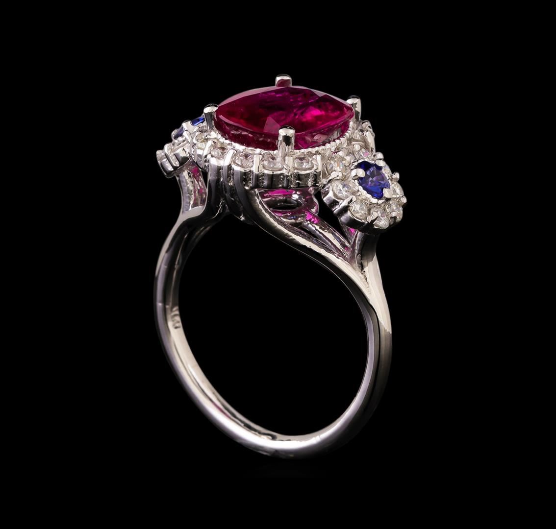 One electronically tested 14KT white gold ladies combination cast & assembled tourmaline, sapphire & diamond Ring with a half round shank with a bright polish finish. Identified with markings of "14K". Condition is new. Containing: One prong set oval modified brilliant cut natural pink tourmaline, measuring 11.20 x 7.91 x 4.60mm, approximate weight of 2.62ct., clarity is moderately included, type II, medium, moderately strong, purple red color, (GIA PR 5/4), cut is good. Two prong set round modified brilliant cut natural blue sapphires, measuring 3.20 - 3.20 x 2.08 mm, approximate total weight of 0.34ct., clarity is slightly included, type II, medium dark, moderately strong, blue color, (GIA B 6/4), cut is good. Thirty prong set round brilliant cut diamonds, measuring 1.50 - 1.50 x 0.90mm (depth est.) approximate total weight of 30 Stones = 0.37ct. Clarity: I-1. Color: I - J, Cut is Good. All diamonds and colored gemstones are graded in the mounting, unless otherwise stated. Colored gemstones are presumed to have been subjected to commonly used enhancement processes. Total Weight of Colored Stones 2.96ct. Total Weight of Diamonds 0.37ct. Total Weight of Ring 6.40 grams. GGL Appraised.