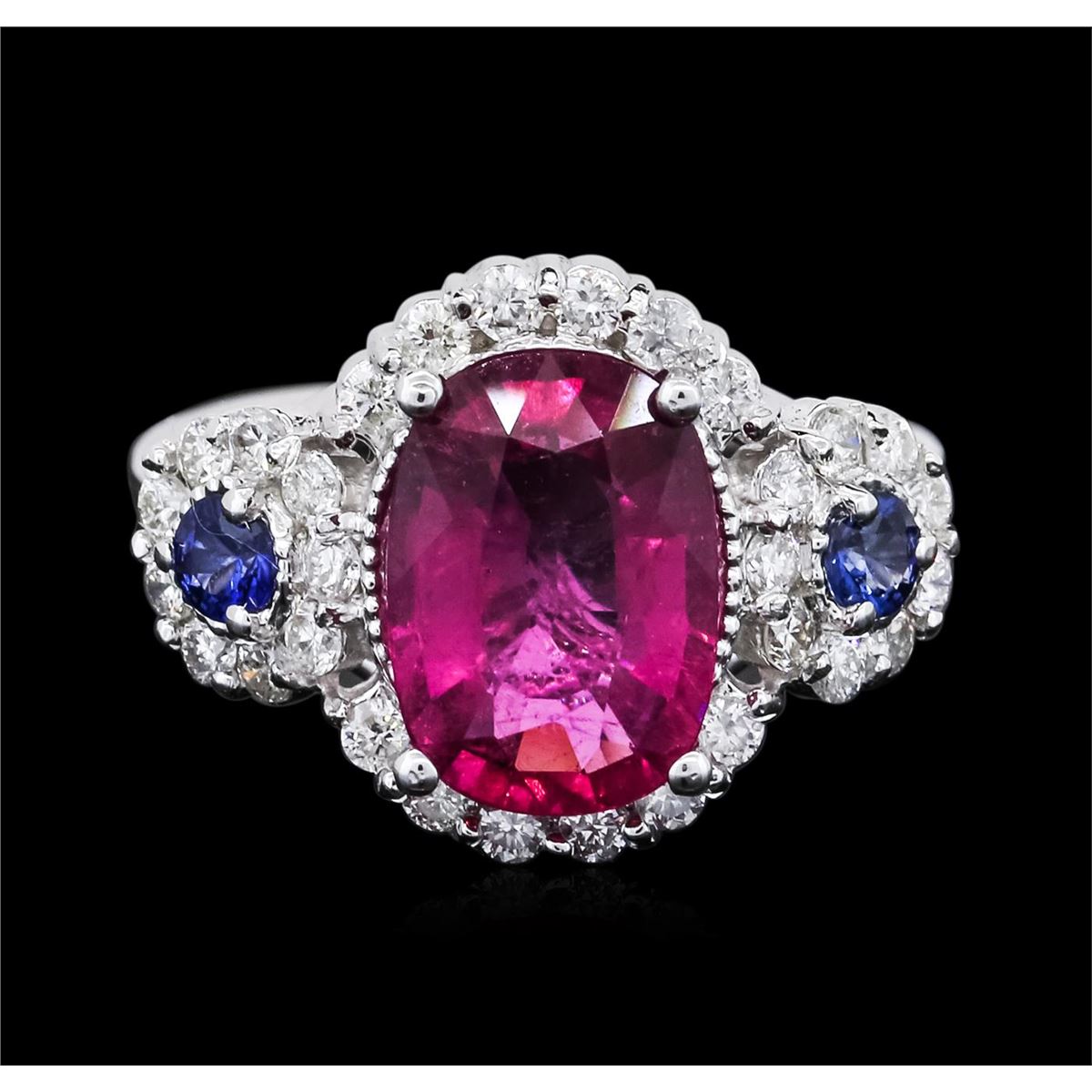 One electronically tested 14KT white gold ladies combination cast & assembled tourmaline, sapphire & diamond Ring with a half round shank with a bright polish finish. Identified with markings of "14K". Condition is new. Containing: One prong set oval modified brilliant cut natural pink tourmaline, measuring 11.20 x 7.91 x 4.60mm, approximate weight of 2.62ct., clarity is moderately included, type II, medium, moderately strong, purple red color, (GIA PR 5/4), cut is good. Two prong set round modified brilliant cut natural blue sapphires, measuring 3.20 - 3.20 x 2.08 mm, approximate total weight of 0.34ct., clarity is slightly included, type II, medium dark, moderately strong, blue color, (GIA B 6/4), cut is good. Thirty prong set round brilliant cut diamonds, measuring 1.50 - 1.50 x 0.90mm (depth est.) approximate total weight of 30 Stones = 0.37ct. Clarity: I-1. Color: I - J, Cut is Good. All diamonds and colored gemstones are graded in the mounting, unless otherwise stated. Colored gemstones are presumed to have been subjected to commonly used enhancement processes. Total Weight of Colored Stones 2.96ct. Total Weight of Diamonds 0.37ct. Total Weight of Ring 6.40 grams. GGL Appraised at $3,810.00.