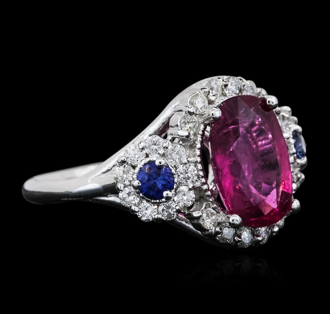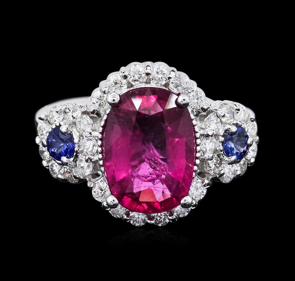 One electronically tested 14KT white gold ladies combination cast & assembled tourmaline, sapphire & diamond Ring with a half round shank with a bright polish finish. Identified with markings of "14K". Condition is new. Containing: One prong set oval modified brilliant cut natural pink tourmaline, measuring 11.20 x 7.91 x 4.60mm, approximate weight of 2.62ct., clarity is moderately included, type II, medium, moderately strong, purple red color, (GIA PR 5/4), cut is good. Two prong set round modified brilliant cut natural blue sapphires, measuring 3.20 - 3.20 x 2.08 mm, approximate total weight of 0.34ct., clarity is slightly included, type II, medium dark, moderately strong, blue color, (GIA B 6/4), cut is good. Thirty prong set round brilliant cut diamonds, measuring 1.50 - 1.50 x 0.90mm (depth est.) approximate total weight of 30 Stones = 0.37ct. Clarity: I-1. Color: I - J, Cut is Good. All diamonds and colored gemstones are graded in the mounting, unless otherwise stated. Colored gemstones are presumed to have been subjected to commonly used enhancement processes. Total Weight of Colored Stones 2.96ct. Total Weight of Diamonds 0.37ct. Total Weight of Ring 6.40 grams. GGL Appraised at $3,810.00.