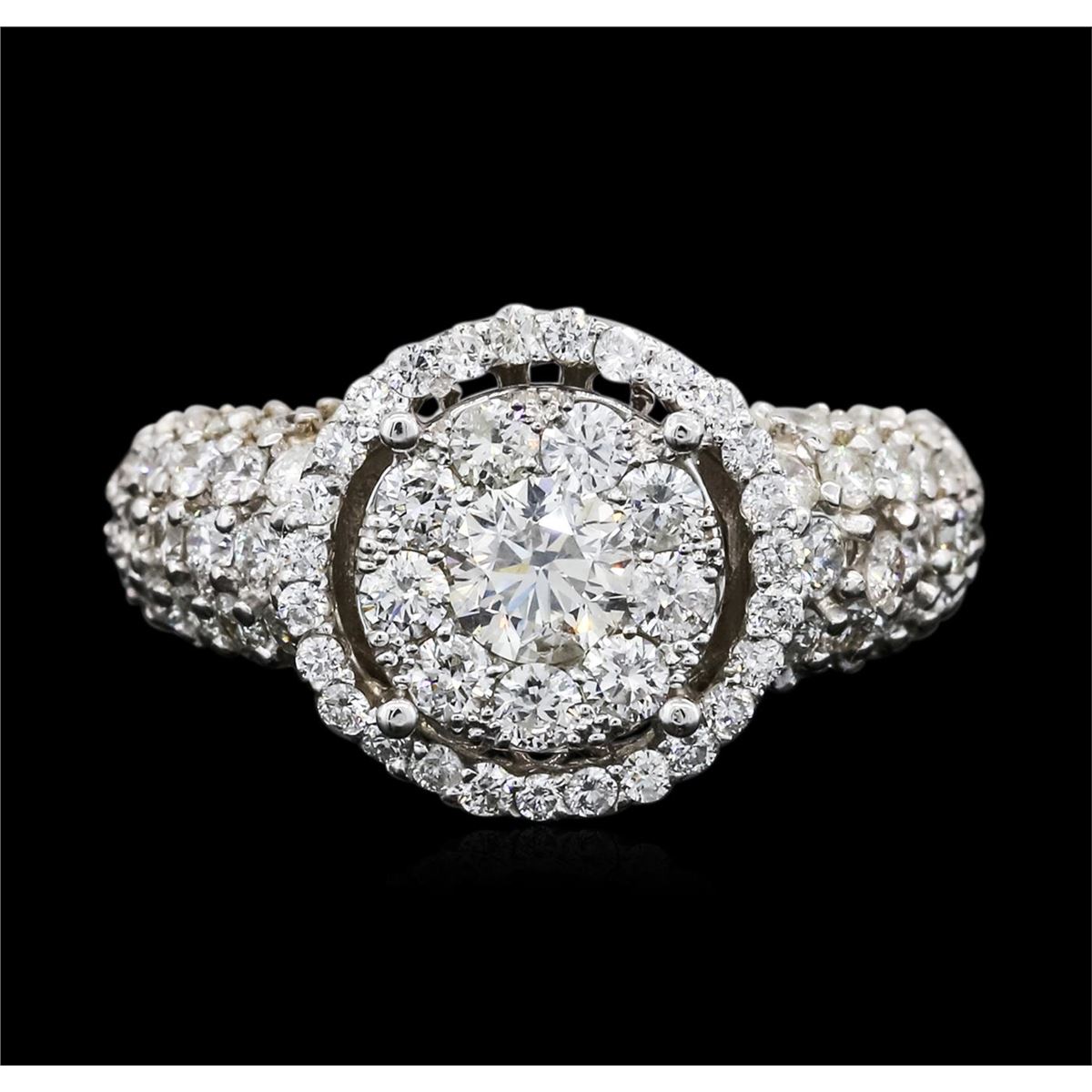 One electronically tested 14KT white gold ladies cast diamond ring with a bright polish finish. The ring features an organized diamond cluster set within a diamond bezel supported by diamond set shoulders, completed by a three millimeter wide band. Identified with markings of "14K". Condition is new, good workmanship. Containing: One prong set round brilliant cut diamond, measuring 4.80 - 4.70 x 3.04mm (depth est.) approximate weight of 0.42ct. Graded in the setting. Clarity: I-1. Color: H Sixty-Five prong set round brilliant cut diamonds, measuring 2.00 - 1.90 x 1.17mm (depth est.) approximate total weight of 65 Stones = 1.86ct. Graded in the setting. Clarity: SI-1 to I-1. Color: G - I Twenty-Seven prong set round brilliant cut diamonds, measuring 1.40 - 1.30 x 0.81mm (depth est.) approximate total weight of 27 Stones = 0.34ct. Graded in the setting. Clarity: SI-1 to I-1. Color: G - I. Total Weight of Diamonds 2.62ct. Total Weight of Ring 6.38 grams. AIG Appraised at $8,705.00.