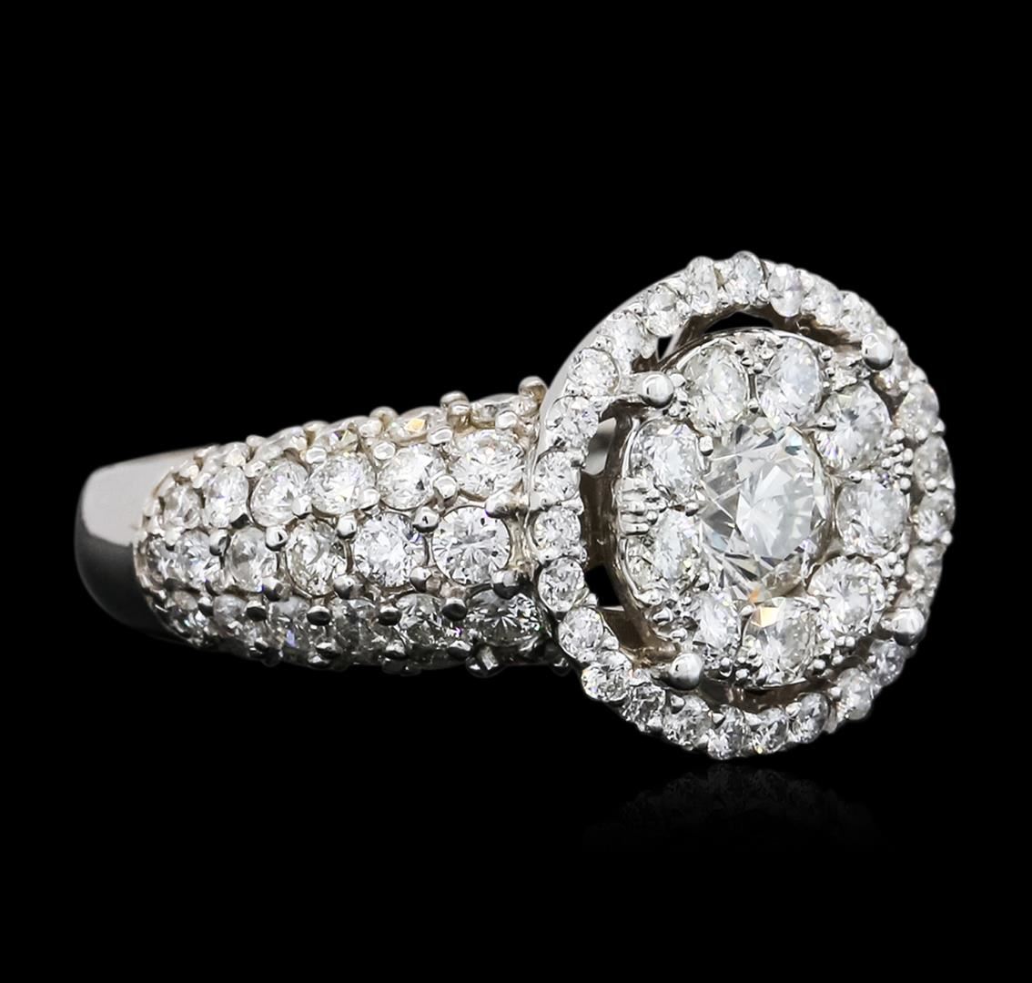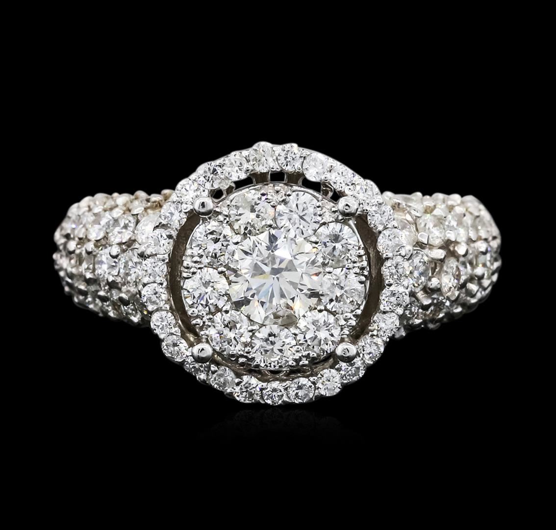One electronically tested 14KT white gold ladies cast diamond ring with a bright polish finish. The ring features an organized diamond cluster set within a diamond bezel supported by diamond set shoulders, completed by a three millimeter wide band. Identified with markings of "14K". Condition is new, good workmanship. Containing: One prong set round brilliant cut diamond, measuring 4.80 - 4.70 x 3.04mm (depth est.) approximate weight of 0.42ct. Graded in the setting. Clarity: I-1. Color: H Sixty-Five prong set round brilliant cut diamonds, measuring 2.00 - 1.90 x 1.17mm (depth est.) approximate total weight of 65 Stones = 1.86ct. Graded in the setting. Clarity: SI-1 to I-1. Color: G - I Twenty-Seven prong set round brilliant cut diamonds, measuring 1.40 - 1.30 x 0.81mm (depth est.) approximate total weight of 27 Stones = 0.34ct. Graded in the setting. Clarity: SI-1 to I-1. Color: G - I. Total Weight of Diamonds 2.62ct. Total Weight of Ring 6.38 grams. AIG Appraised at $8,705.00.