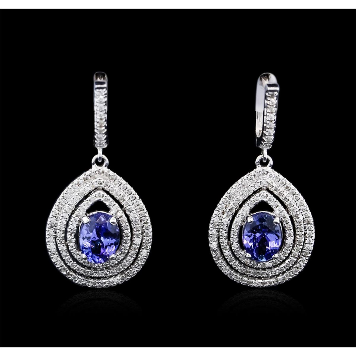 One pair electronically tested 14KT white gold ladies combination cast & assembled tanzanite and diamond earrings with lever backs with a bright polish finish. Identified with markings of "585". Condition is new. Containing: Two prong set oval modified brilliant cut natural tanzanites, measuring 7.88 x 6.04 x 3.90mm, approximate total weight of 2.62ct., clarity is eye clean, type I, medium light, very slightly grayish, violet color, (GIA V 4/3), cut is good. One Hundred Twenty-Two prong set round brilliant cut diamonds, measuring 1.00 - 1.00 x 0.60mm (depth est.) approximate total weight of 122 Stones = 0.44ct. Clarity: I-1 to I-2. Color: I - J, Cut is Good. All diamonds and colored gemstones are graded in the mounting, unless otherwise stated. Colored gemstones are presumed to have been subjected to commonly used enhancement processes. Total Weight of Colored Stones 2.62ct. Total Weight of Diamonds 0.44ct. Total Weight of Earrings 7.80 grams. GGL Appraised at $5,225.00.