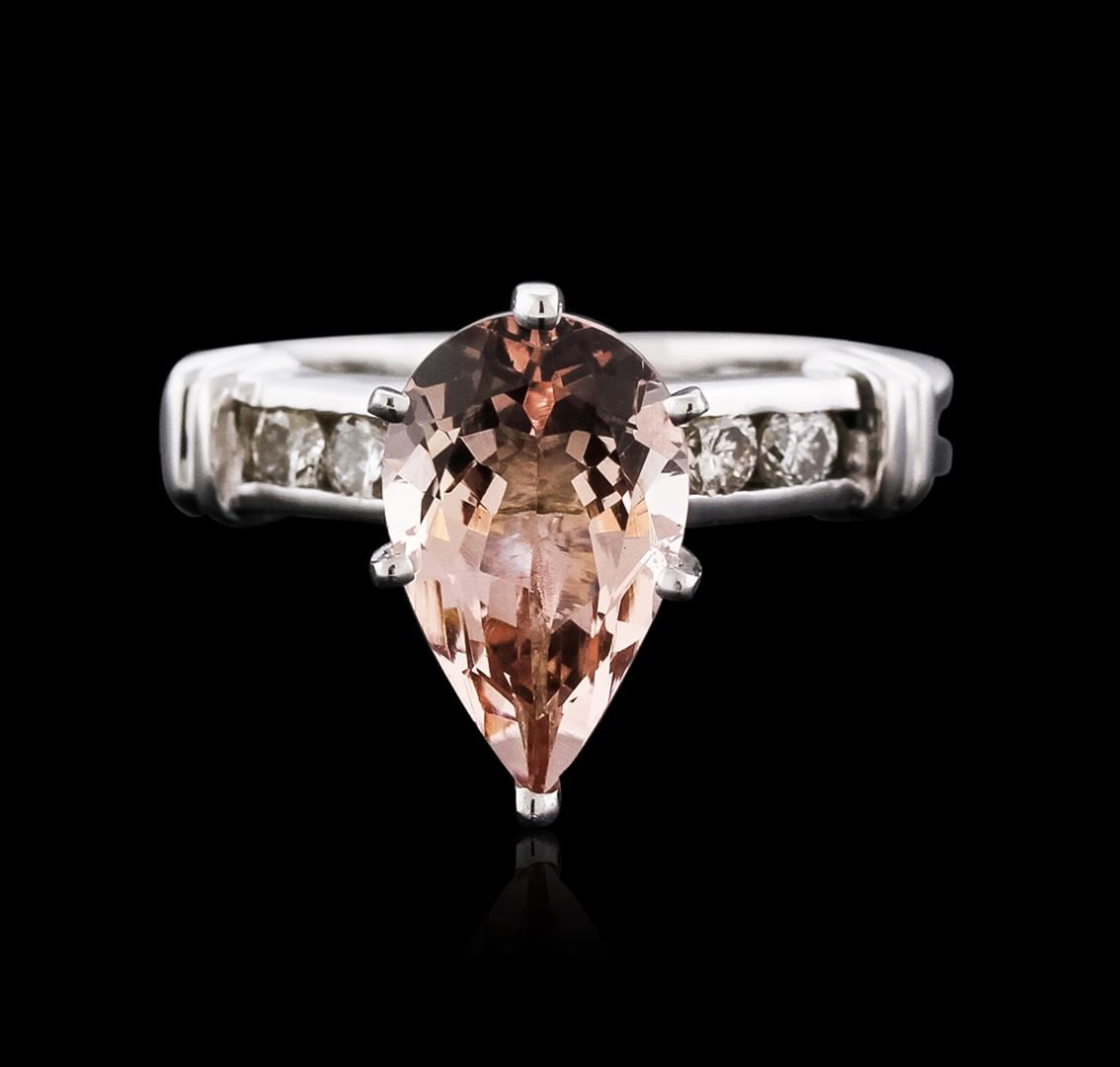 One ring featuring: 14KT white gold weighing a total of 4.6 grams containing one pear cut morganite center weighing 2.63ct and round diamonds weighing a total of 0.33ct.
