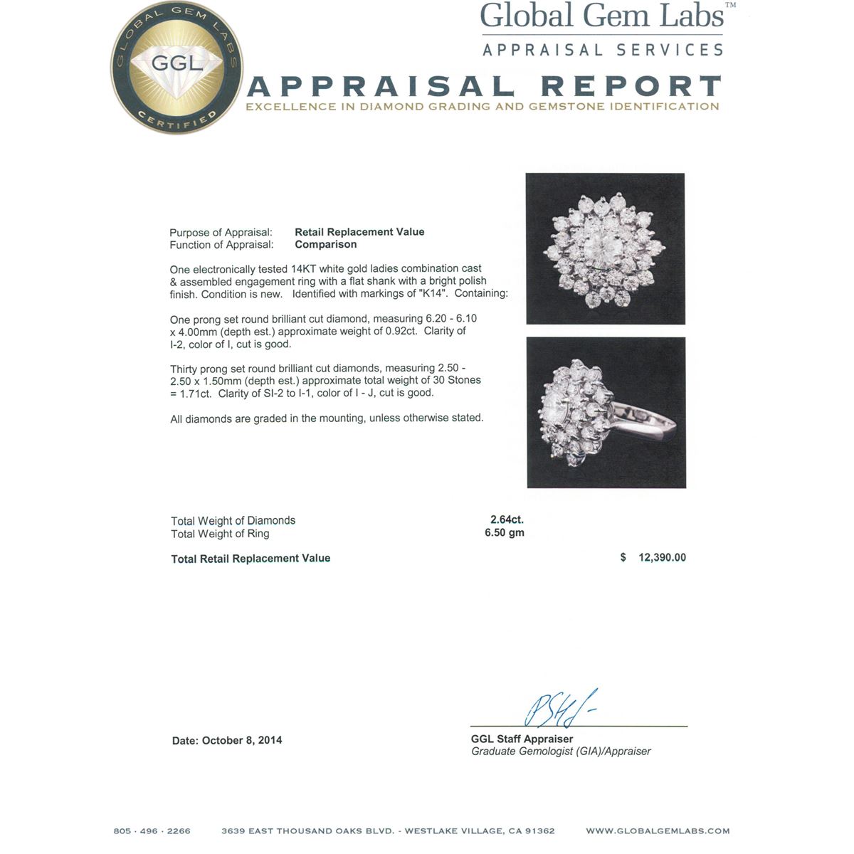 One electronically tested 14KT white gold ladies combination cast & assembled engagement ring with a flat shank with a bright polish finish. Identified with markings of "K14". Condition is new. Containing: One prong set round brilliant cut diamond, measuring 6.20 - 6.10 x 4.00mm (depth est.) approximate weight of 0.92ct. Clarity: I-2. Color: I, Cut is Good. Thirty prong set round brilliant cut diamonds, measuring 2.50 - 2.50 x 1.50mm (depth est.) approximate total weight of 30 Stones = 1.71ct. Clarity: SI-2 to I-1. Color: I - J, Cut is Good. All diamonds are graded in the mounting, unless otherwise stated. Total Weight of Diamonds 2.64ct. Total Weight of Ring 6.50 grams. GGL Appraised at $12,390.00.