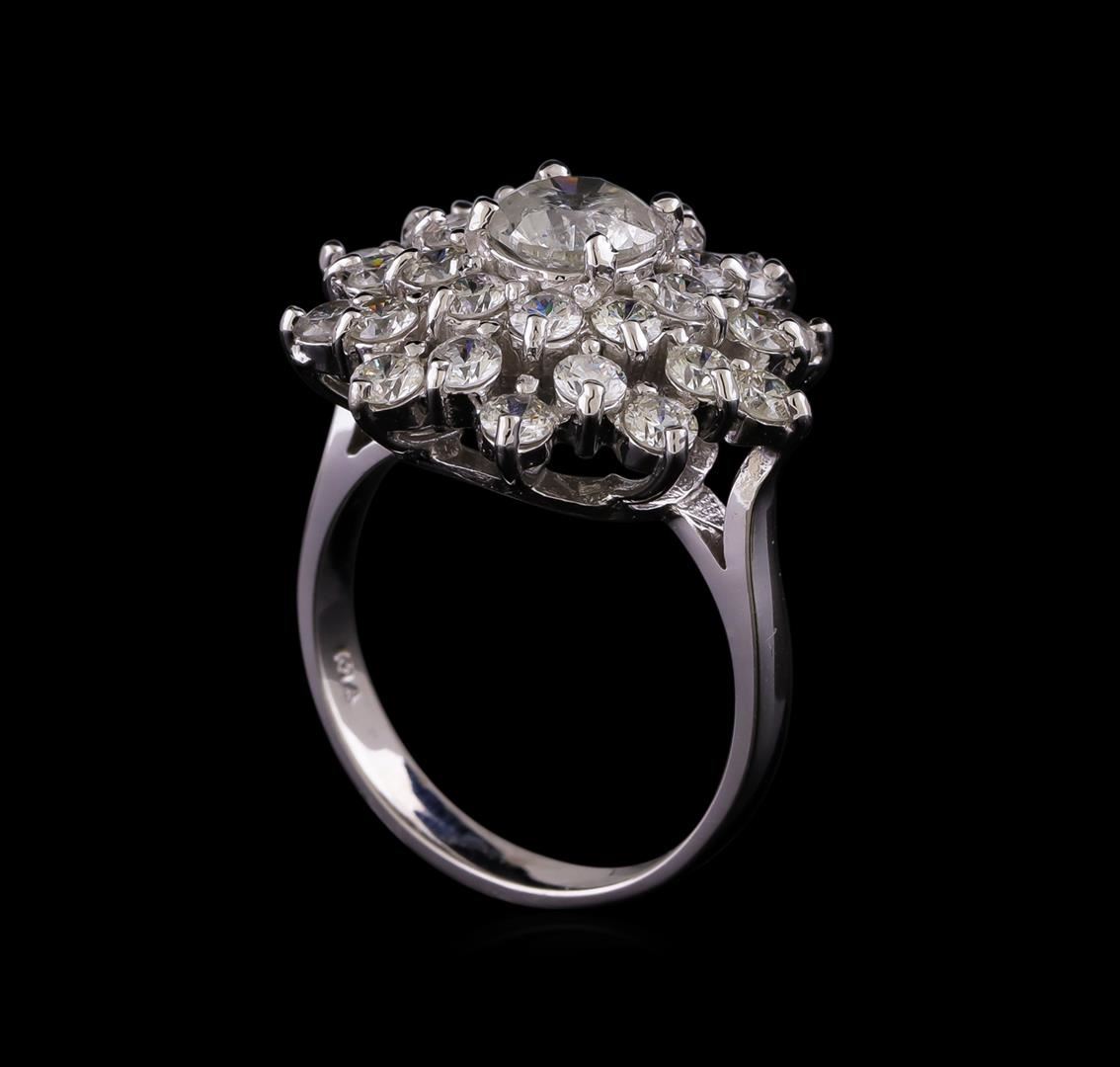 One electronically tested 14KT white gold ladies combination cast & assembled engagement ring with a flat shank with a bright polish finish. Identified with markings of "K14". Condition is new. Containing: One prong set round brilliant cut diamond, measuring 6.20 - 6.10 x 4.00mm (depth est.) approximate weight of 0.92ct. Clarity: I-2. Color: I, Cut is Good. Thirty prong set round brilliant cut diamonds, measuring 2.50 - 2.50 x 1.50mm (depth est.) approximate total weight of 30 Stones = 1.71ct. Clarity: SI-2 to I-1. Color: I - J, Cut is Good. All diamonds are graded in the mounting, unless otherwise stated. Total Weight of Diamonds 2.64ct. Total Weight of Ring 6.50 grams. GGL Appraised at $12,390.00.