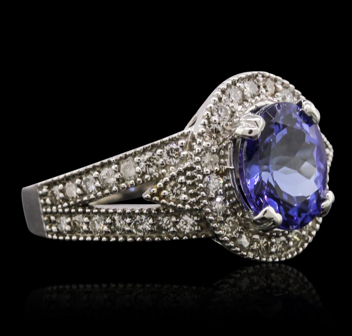 One electronically tested 14KT white gold Ladies combination cast & assembled ring with a bright polish finish. Condition is new. Identified with markings of "K14". Containing: One prong set oval modified brilliant cut natural tanzanite, measuring 9.40 x 8.00 x 5.20mm, approximate weight of 2.64ct., clarity is eye clean, type I, medium, moderately strong, bluish violet color, (GIA bV 5/4), cut is good. Colored gemstones are presumed to have been subjected to commonly used color/clarity enhancement processes. Fifty-One prong set round brilliant cut diamonds, measuring 1.50 - 1.50 x 0.90mm (depth est.) approximate. Total Weight of 51 Stones = 0.63ct. Clarity: I-1 to I-2. Color: I - J, Cut is Good. Total Weight of Colored Stones 2.64ct. Total Weight of Diamonds 0.63ct. Total Weight of Ring 7.20 grams. GGL Appraised at $6,955.00.