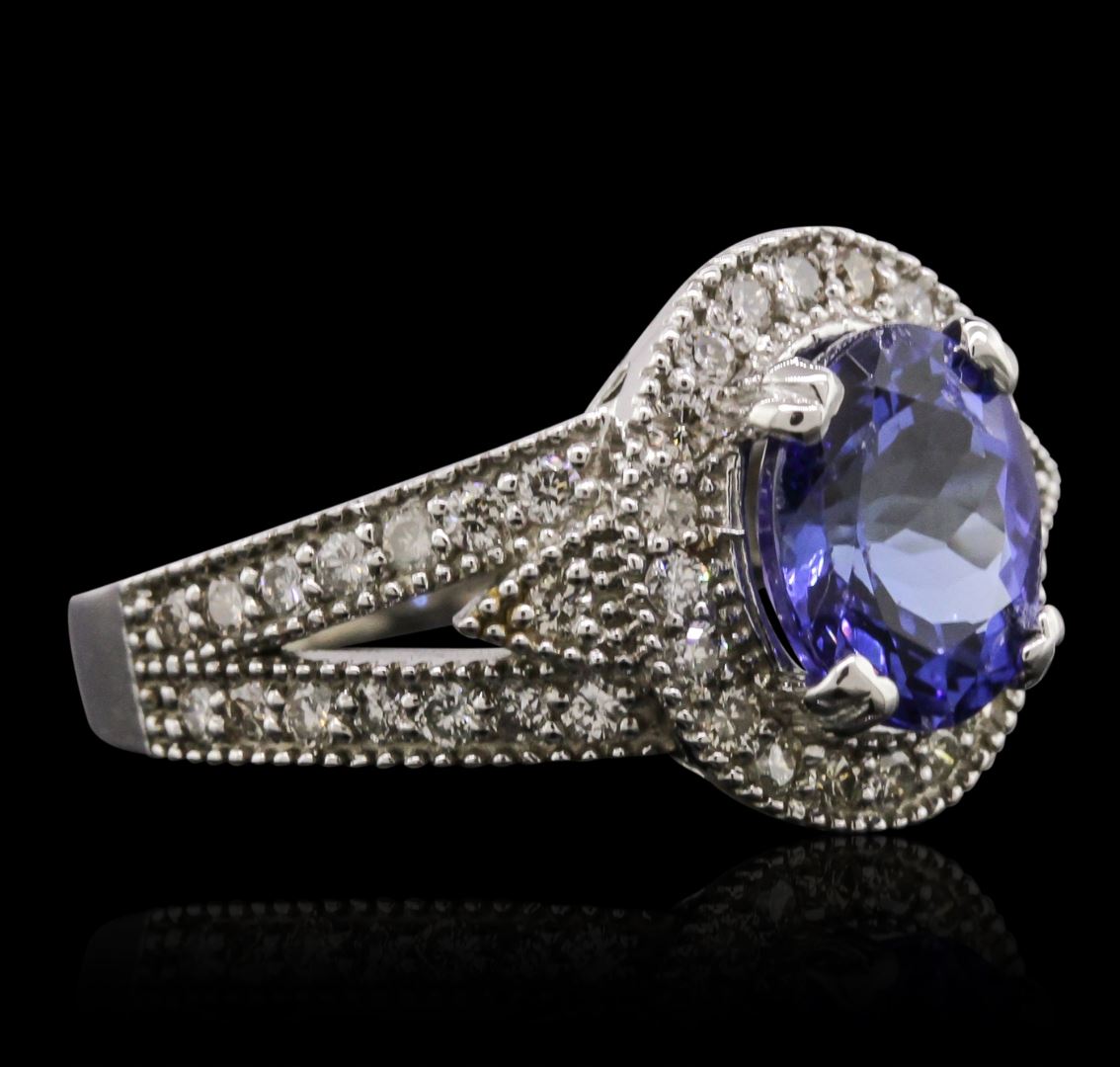 One electronically tested 14KT white gold Ladies combination cast & assembled ring with a bright polish finish. Condition is new. Identified with markings of "K14". Containing: One prong set oval modified brilliant cut natural tanzanite, measuring 9.40 x 8.00 x 5.20mm, approximate weight of 2.64ct., clarity is eye clean, type I, medium, moderately strong, bluish violet color, (GIA bV 5/4), cut is good. Colored gemstones are presumed to have been subjected to commonly used color/clarity enhancement processes. Fifty-One prong set round brilliant cut diamonds, measuring 1.50 - 1.50 x 0.90mm (depth est.) approximate. Total Weight of 51 Stones = 0.63ct. Clarity: I-1 to I-2. Color: I - J, Cut is Good. Total Weight of Colored Stones 2.64ct. Total Weight of Diamonds 0.63ct. Total Weight of Ring 7.20 grams. GGL Appraised at $6,955.00.