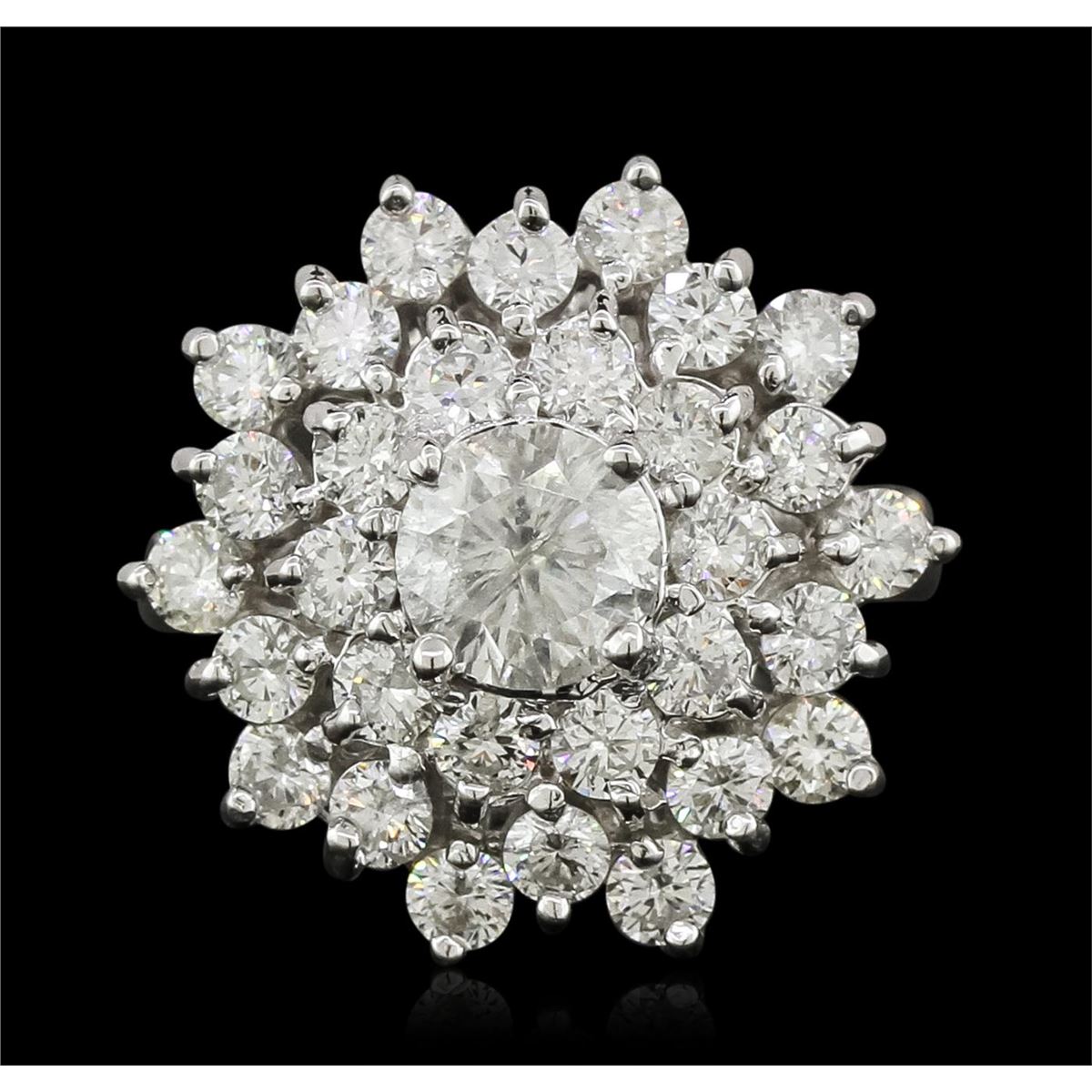 One electronically tested 14KT white gold ladies combination cast & assembled engagement ring with a flat shank with a bright polish finish. Identified with markings of "K14". Condition is new. Containing: One prong set round brilliant cut diamond, measuring 6.20 - 6.10 x 4.00mm (depth est.) approximate weight of 0.92ct. Clarity: I-2. Color: I, Cut is Good. Thirty prong set round brilliant cut diamonds, measuring 2.50 - 2.50 x 1.50mm (depth est.) approximate total weight of 30 Stones = 1.71ct. Clarity: SI-2 to I-1. Color: I - J, Cut is Good. All diamonds are graded in the mounting, unless otherwise stated. Total Weight of Diamonds 2.64ct. Total Weight of Ring 6.50 grams. GGL Appraised at $12,390.00.