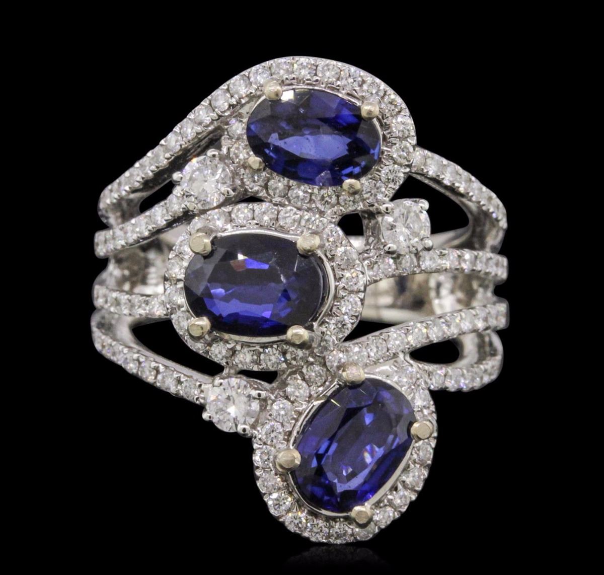 One electronically tested 14KT white gold ladies combination cast & assembled sapphire and diamond ring with a split shank with a bright polish finish. Identified with markings of "14K". Condition is new. Containing: Three prong set oval modified brilliant cut natural blue sapphires, measuring 6.82 x 4.90 x 3.19mm, approximate total weight of 2.64ct., clarity is eye clean, type II, medium dark, moderately strong, blue color, (GIA B 6/4), cut is very good. Three prong set round brilliant cut diamonds, measuring 2.80 - 2.80 x 1.68mm (depth est.) approximate total weight of 3 Stones = 0.24ct. Clarity: SI-2 to I-1. Color: I - J, Cut is Good. One Hundred Twenty prong set round brilliant cut diamonds, measuring 1.10 - 1.10 x 0.66mm (depth est.) approximate total weight of 120 Stones = 0.58ct. Clarity: I-1 to I-2. Color: I - J, Cut is Good. Colored gemstones are presumed to have been subjected to commonly used enhancement processes. All diamonds and colored gemstones are graded in the mounting, unless otherwise stated. Total Weight of Colored Stones 2.64ct. Total Weight of Diamonds 0.82ct. Total Weight of Ring 9.80 grams. GGL Appraised at $10,490.00.