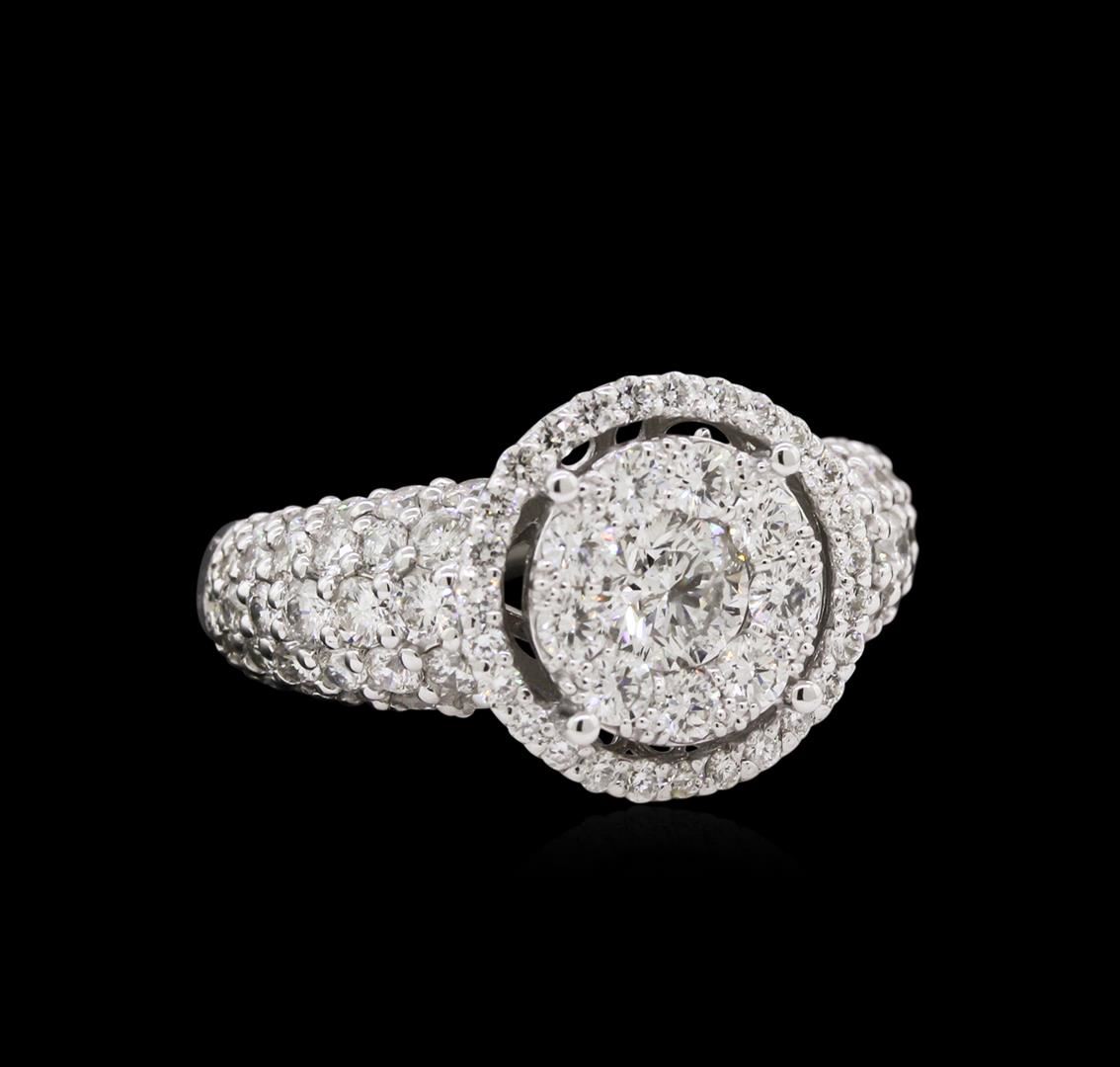 One electronically tested 14KT white gold ladies cast diamond ring with a bright polish finish. The ring features an organized diamond cluster set within a diamond bezel supported by diamond set shoulders, completed by a three millimeter wide band. Identified with markings of "14K". Condition is new, good workmanship. Containing: One prong set round brilliant cut diamond, measuring 4.90 - 4.80 x 3.00mm (depth est.) approximate weight of 0.45ct. Graded in the setting. Clarity: I-1. Color: H Sixty-Five prong set round brilliant cut diamonds, measuring 2.00 - 1.90 x 1.17mm (depth est.) approximate total weight of 65 Stones = 1.85ct. Graded in the setting. Clarity: SI-1 to I-1. Color: G - I Twenty-Seven prong set round brilliant cut diamonds, measuring 1.40 - 1.30 x 0.81mm (depth est.) approximate total weight of 27 Stones = 0.35ct. Graded in the setting. Clarity: SI-1 to I-1. Color: G - I. Total Weight of Diamonds 2.65ct. Total Weight of Ring 6.61 grams. AIG Appraised at $9,040.00.