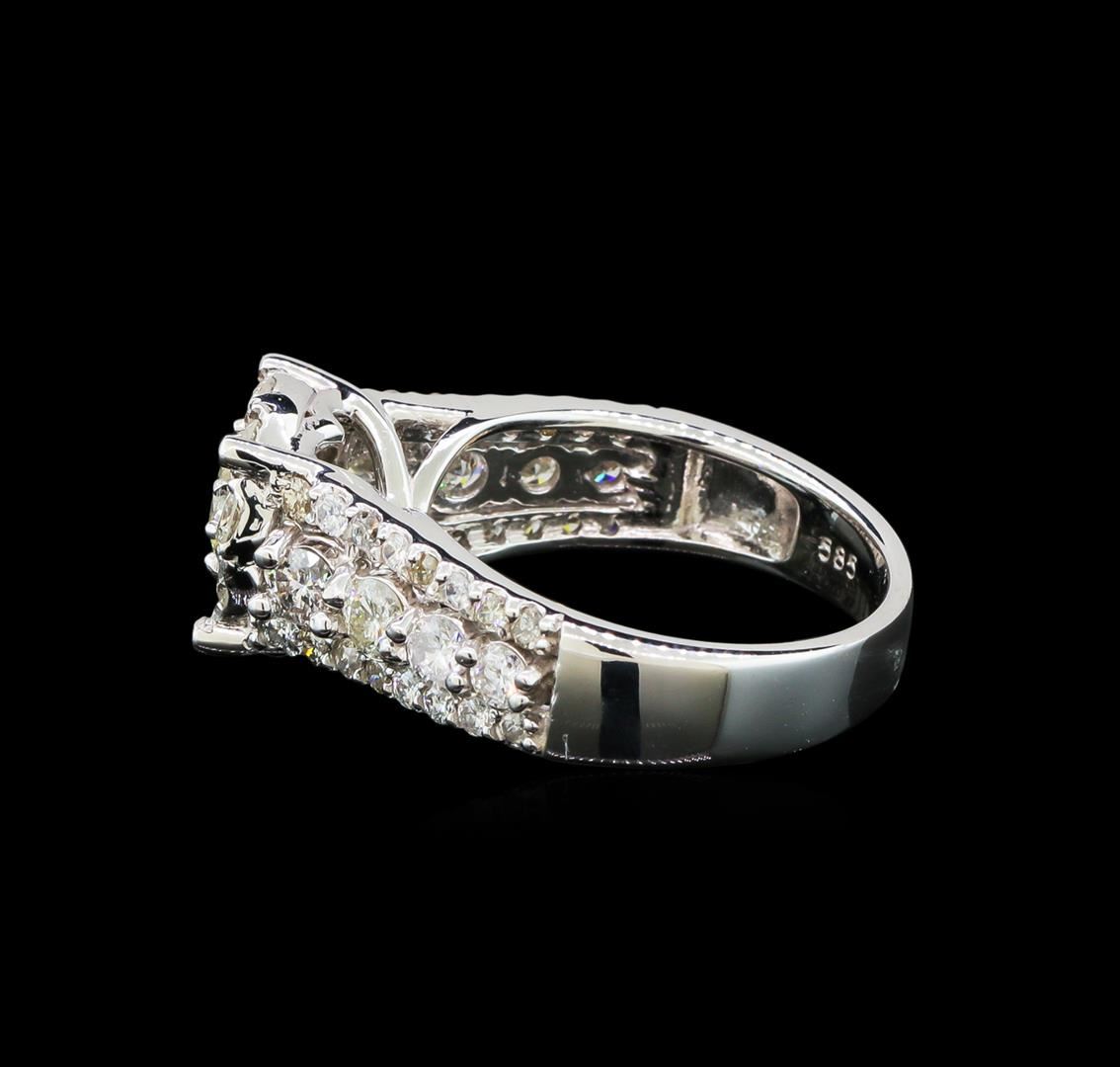 One electronically tested 14KT white gold ladies cast diamond unity ring with a bright polish finish. The featured diamond is set within a diamond bezel supported by tapering diamond set shoulders, completed by a three and one-half millimeter wide band. Identified with markings of "585". Condition is new, good workmanship. Containing: One prong set round brilliant cut diamond, measuring 5.50 - 5.40 x 3.10mm (depth est.) approximate weight of 0.58ct with a faint blue fluorescence. Graded in the setting. Clarity: I-1. Color: K Eighteen prong set round brilliant cut diamonds, measuring 3.10 - 2.50 x 1.68mm (depth est.) approximate total weight of 18 Stones = 1.45ct. Graded in the setting. Clarity: SI-2 to I-2. Color: H - J Thirty-Two prong set round brilliant cut diamonds, measuring 1.70 - 1.60 x 0.99mm (depth est.) approximate total weight of 32 Stones = 0.62ct. Graded in the setting. Clarity: SI-2 to I-2. Color: H - J. Total Weight of Diamonds 2.65ct. Total Weight of Ring 6.53 grams. AIG Appraised at $8,595.00.