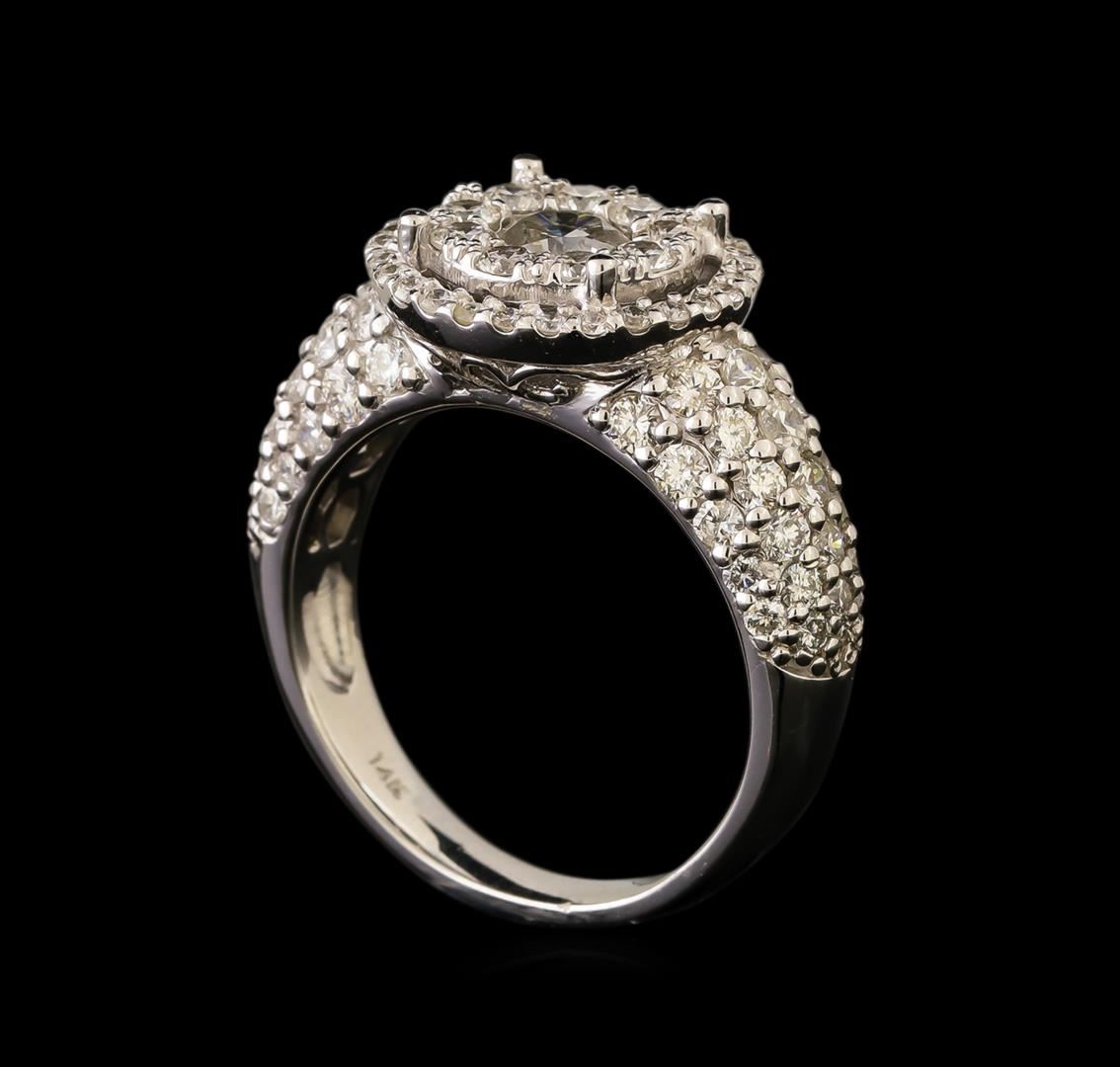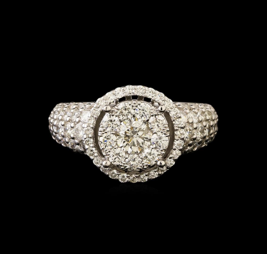 One electronically tested 14KT white gold ladies cast diamond ring with a bright polish finish. The ring features an organized diamond cluster set within a diamond bezel supported by diamond set shoulders, completed by a three millimeter wide band. Identified with markings of "14K". Condition is new, good workmanship. Containing: One prong set round brilliant cut diamond, measuring 4.90 - 4.80 x 3.00mm (depth est.) approximate weight of 0.45ct. Graded in the setting. Clarity: I-1. Color: H Sixty-Five prong set round brilliant cut diamonds, measuring 2.00 - 1.90 x 1.17mm (depth est.) approximate total weight of 65 Stones = 1.85ct. Graded in the setting. Clarity: SI-1 to I-1. Color: G - I Twenty-Seven prong set round brilliant cut diamonds, measuring 1.40 - 1.30 x 0.81mm (depth est.) approximate total weight of 27 Stones = 0.35ct. Graded in the setting. Clarity: SI-1 to I-1. Color: G - I. Total Weight of Diamonds 2.65ct. Total Weight of Ring 6.61 grams. AIG Appraised at $9,040.00.