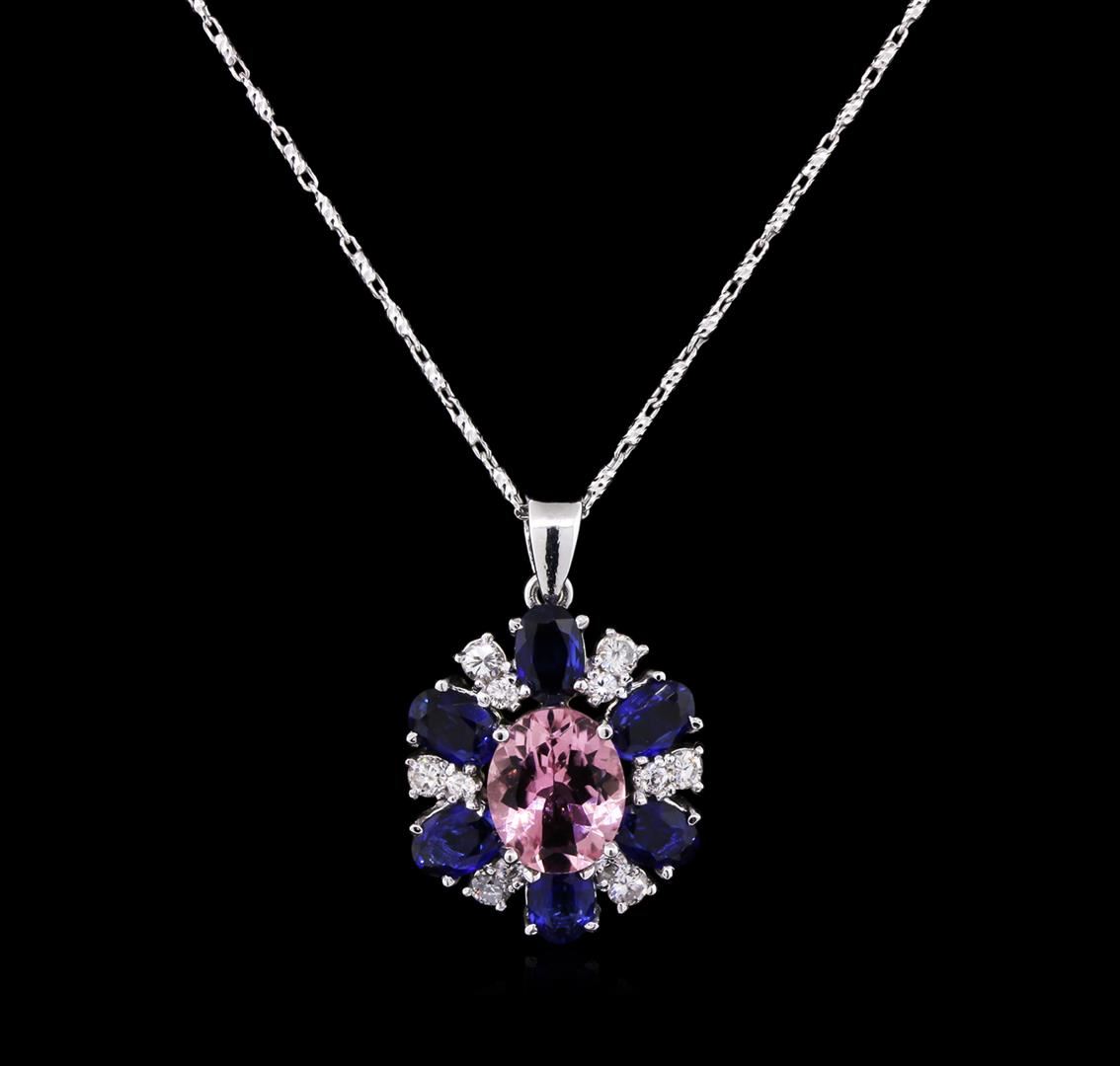 One electronically tested 14KT white gold ladies cast tourmaline, sapphire & diamond pendant & chain 18.0" long, fancy link with a lobster claw clasp with a bright polish finish. Identified with markings of "14K". Condition is new. Containing: One prong set oval modified brilliant cut natural pink tourmaline, measuring 9.91 x 8.00 x 5.20mm, approximate weight of 2.65ct., clarity is eye clean, type II, light, slightly grayish, reddish purple color, (GIA rP 3/2), cut is good. Six prong set oval modified brilliant cut natural blue sapphires, measuring 5.20 x 4.00 x 2.60mm, approximate total weight of 2.70ct., clarity is eye clean, type II, medium, moderately strong, blue color, (GIA B 5/4), cut is good. Twelve prong set round brilliant cut diamonds, measuring 2.20 - 1.50 x 1.11mm (depth est.) approximate total weight of 12 Stones = 0.28ct. Clarity: SI-2. Color: I - J, Cut is Good. Colored gemstones are presumed to have been subjected to commonly used enhancement processes. All diamonds and colored gemstones are graded in the mounting, unless otherwise stated. Total Weight of Colored Stones 5.35ct. Total Weight of Diamonds 0.28ct. Total Weight of Pendant & Chain 8.50 grams. GGL Appraised at $4,095.00.