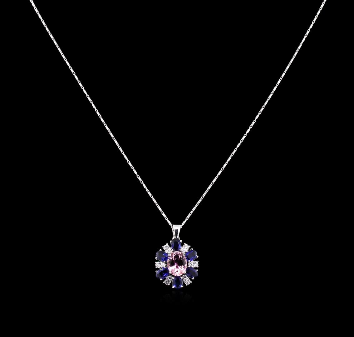 One electronically tested 14KT white gold ladies cast tourmaline, sapphire & diamond pendant & chain 18.0" long, fancy link with a lobster claw clasp with a bright polish finish. Identified with markings of "14K". Condition is new. Containing: One prong set oval modified brilliant cut natural pink tourmaline, measuring 9.91 x 8.00 x 5.20mm, approximate weight of 2.65ct., clarity is eye clean, type II, light, slightly grayish, reddish purple color, (GIA rP 3/2), cut is good. Six prong set oval modified brilliant cut natural blue sapphires, measuring 5.20 x 4.00 x 2.60mm, approximate total weight of 2.70ct., clarity is eye clean, type II, medium, moderately strong, blue color, (GIA B 5/4), cut is good. Twelve prong set round brilliant cut diamonds, measuring 2.20 - 1.50 x 1.11mm (depth est.) approximate total weight of 12 Stones = 0.28ct. Clarity: SI-2. Color: I - J, Cut is Good. Colored gemstones are presumed to have been subjected to commonly used enhancement processes. All diamonds and colored gemstones are graded in the mounting, unless otherwise stated. Total Weight of Colored Stones 5.35ct. Total Weight of Diamonds 0.28ct. Total Weight of Pendant & Chain 8.50 grams. GGL Appraised at $4,095.00.