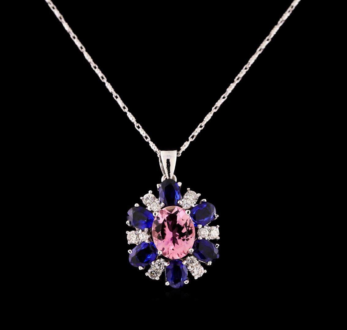One electronically tested 14KT white gold ladies cast tourmaline, sapphire & diamond pendant & chain 18.0" long, fancy link with a lobster claw clasp with a bright polish finish. Identified with markings of "14K". Condition is new. Containing: One prong set oval modified brilliant cut natural pink tourmaline, measuring 9.91 x 8.00 x 5.20mm, approximate weight of 2.65ct., clarity is eye clean, type II, light, slightly grayish, reddish purple color, (GIA rP 3/2), cut is good. Six prong set oval modified brilliant cut natural blue sapphires, measuring 5.20 x 4.00 x 2.60mm, approximate total weight of 2.70ct., clarity is eye clean, type II, medium, moderately strong, blue color, (GIA B 5/4), cut is good. Twelve prong set round brilliant cut diamonds, measuring 2.20 - 1.50 x 1.11mm (depth est.) approximate total weight of 12 Stones = 0.28ct. Clarity: SI-2. Color: I - J, Cut is Good. Colored gemstones are presumed to have been subjected to commonly used enhancement processes. All diamonds and colored gemstones are graded in the mounting, unless otherwise stated. Total Weight of Colored Stones 5.35ct. Total Weight of Diamonds 0.28ct. Total Weight of Pendant & Chain 8.50 grams. GGL Appraised at $4,095.00.