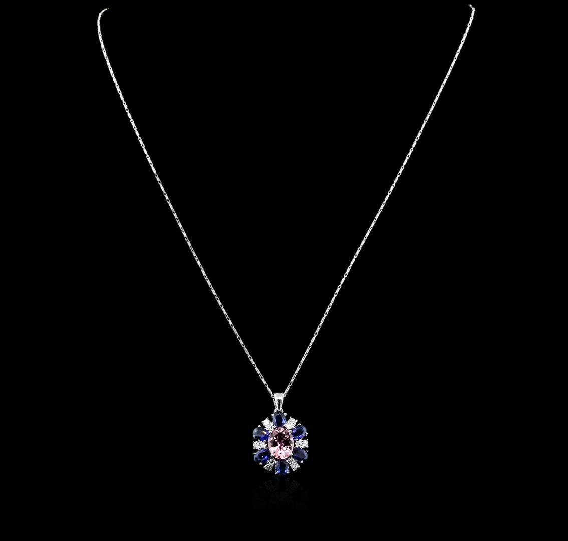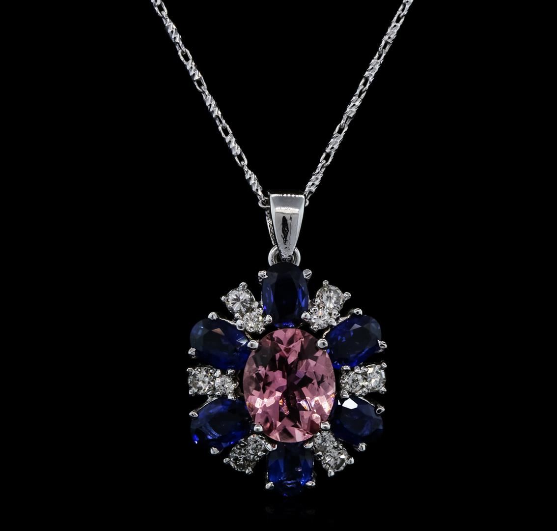 One electronically tested 14KT white gold ladies cast tourmaline, sapphire & diamond pendant & chain 18.0" long, fancy link with a lobster claw clasp with a bright polish finish. Identified with markings of "14K". Condition is new. Containing: One prong set oval modified brilliant cut natural pink tourmaline, measuring 9.91 x 8.00 x 5.20mm, approximate weight of 2.65ct., clarity is eye clean, type II, light, slightly grayish, reddish purple color, (GIA rP 3/2), cut is good. Six prong set oval modified brilliant cut natural blue sapphires, measuring 5.20 x 4.00 x 2.60mm, approximate total weight of 2.70ct., clarity is eye clean, type II, medium, moderately strong, blue color, (GIA B 5/4), cut is good. Twelve prong set round brilliant cut diamonds, measuring 2.20 - 1.50 x 1.11mm (depth est.) approximate total weight of 12 Stones = 0.28ct. Clarity: SI-2. Color: I - J, Cut is Good. Colored gemstones are presumed to have been subjected to commonly used enhancement processes. All diamonds and colored gemstones are graded in the mounting, unless otherwise stated. Total Weight of Colored Stones 5.35ct. Total Weight of Diamonds 0.28ct. Total Weight of Pendant & Chain 8.50 grams. GGL Appraised at $4,095.00.