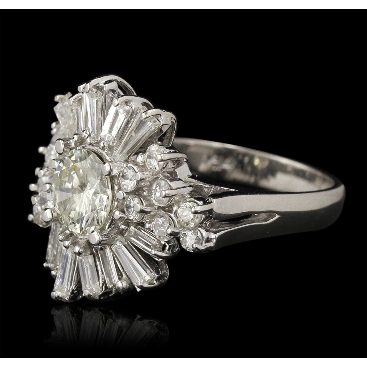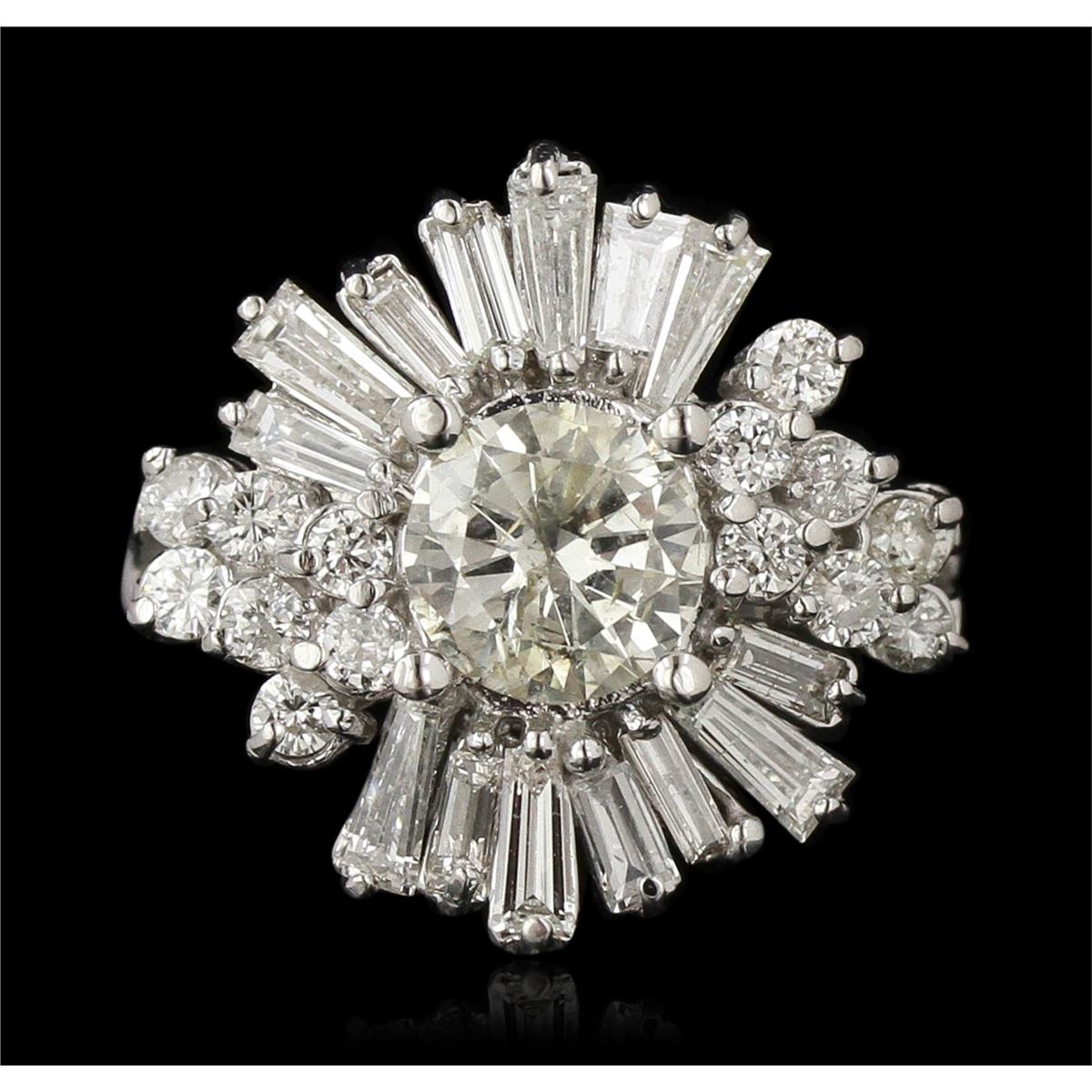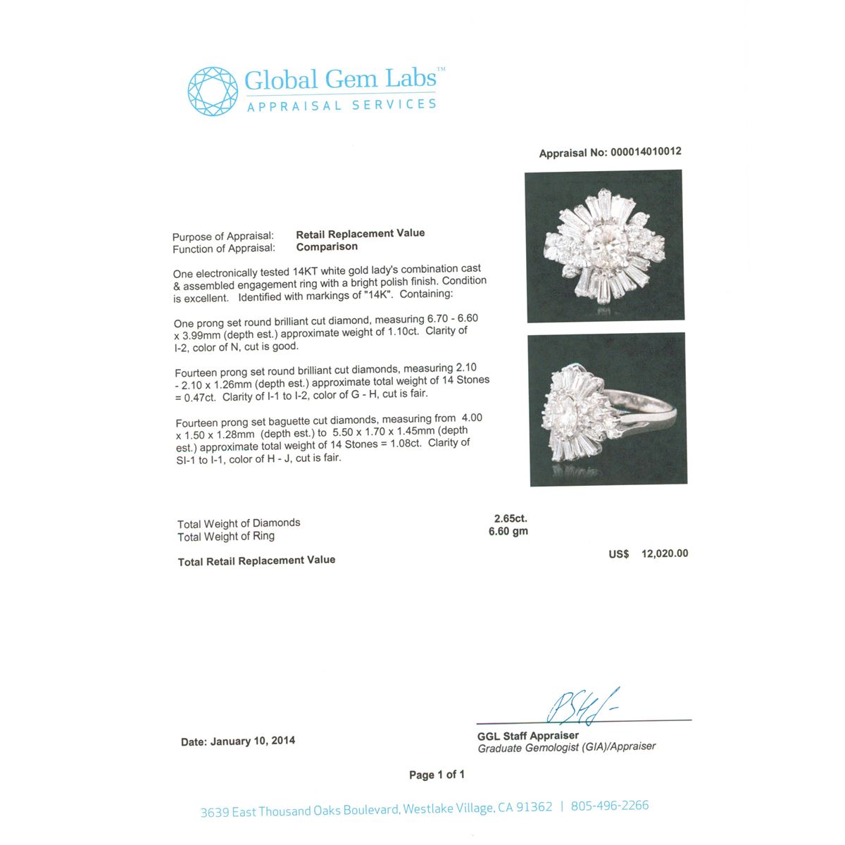 One electronically tested 14KT white gold Ladies combination cast & assembled engagement ring with a bright polish finish. Identified with markings of "14K". Condition is excellent. Containing: One prong set round brilliant cut diamond, measuring 6.70 - 6.60 x 3.99mm (depth est.) approximate weight of 1.10ct. Clarity of I-2, Color of N, Cut is Good. Fourteen prong set round brilliant cut diamonds, measuring 2.10 - 2.10 x 1.26mm (depth est.) approximate total weight of 14 Stones = 0.47ct. Clarity of I-1 to I-2, Color of G - H, Cut is Fair. Fourteen prong set baguette cut diamonds, measuring from 4.00 x 1.50 x 1.28mm (depth est.) to 5.50 x 1.70 x 1.45mm (depth est.) approximate total weight of 14 Stones = 1.08ct. Clarity of SI-1 to I-1, Color of H - J, Cut is Fair. Total Weight of Diamonds 2.65ct. Total Weight of Ring 6.60gm. GGL Appraised at $12,020.00.