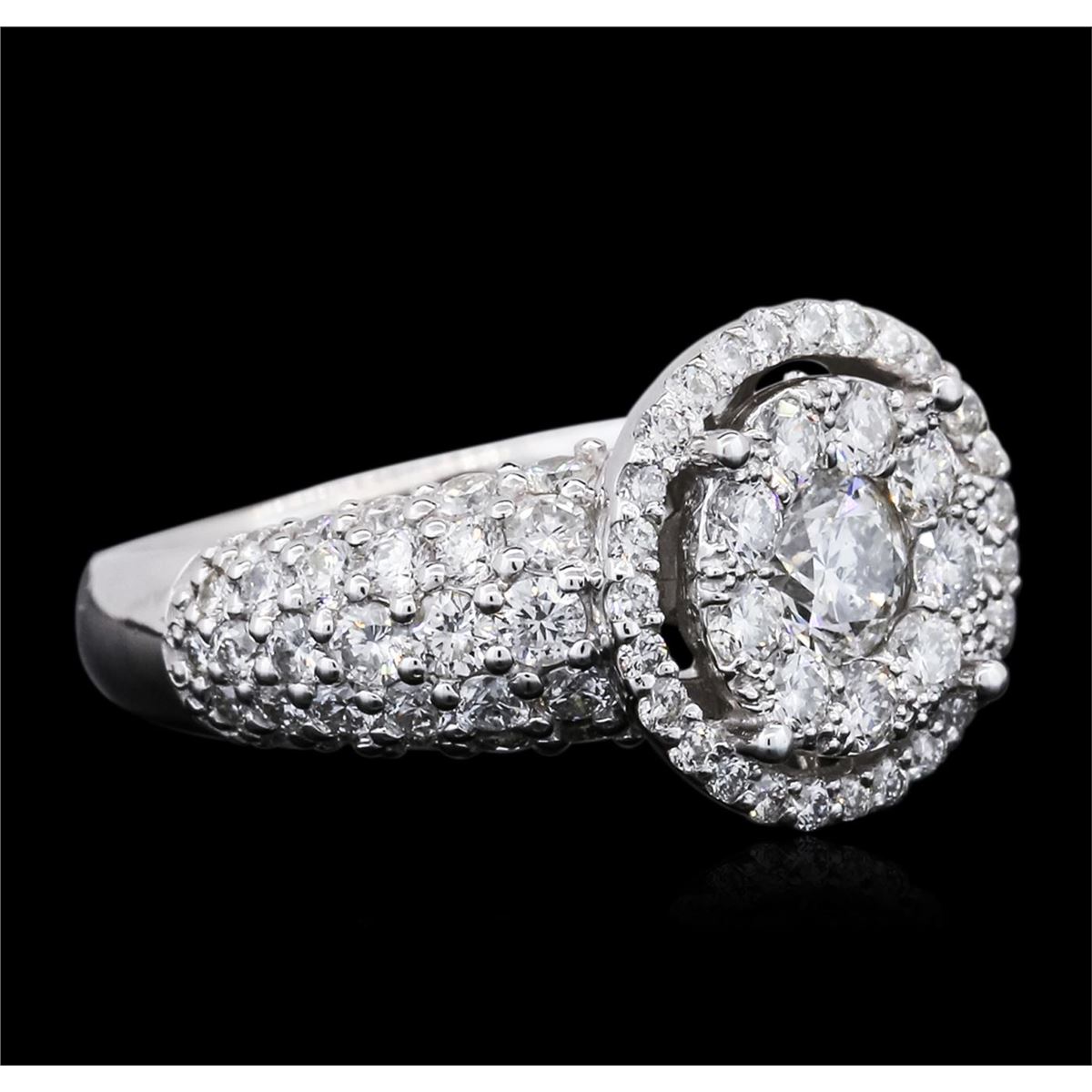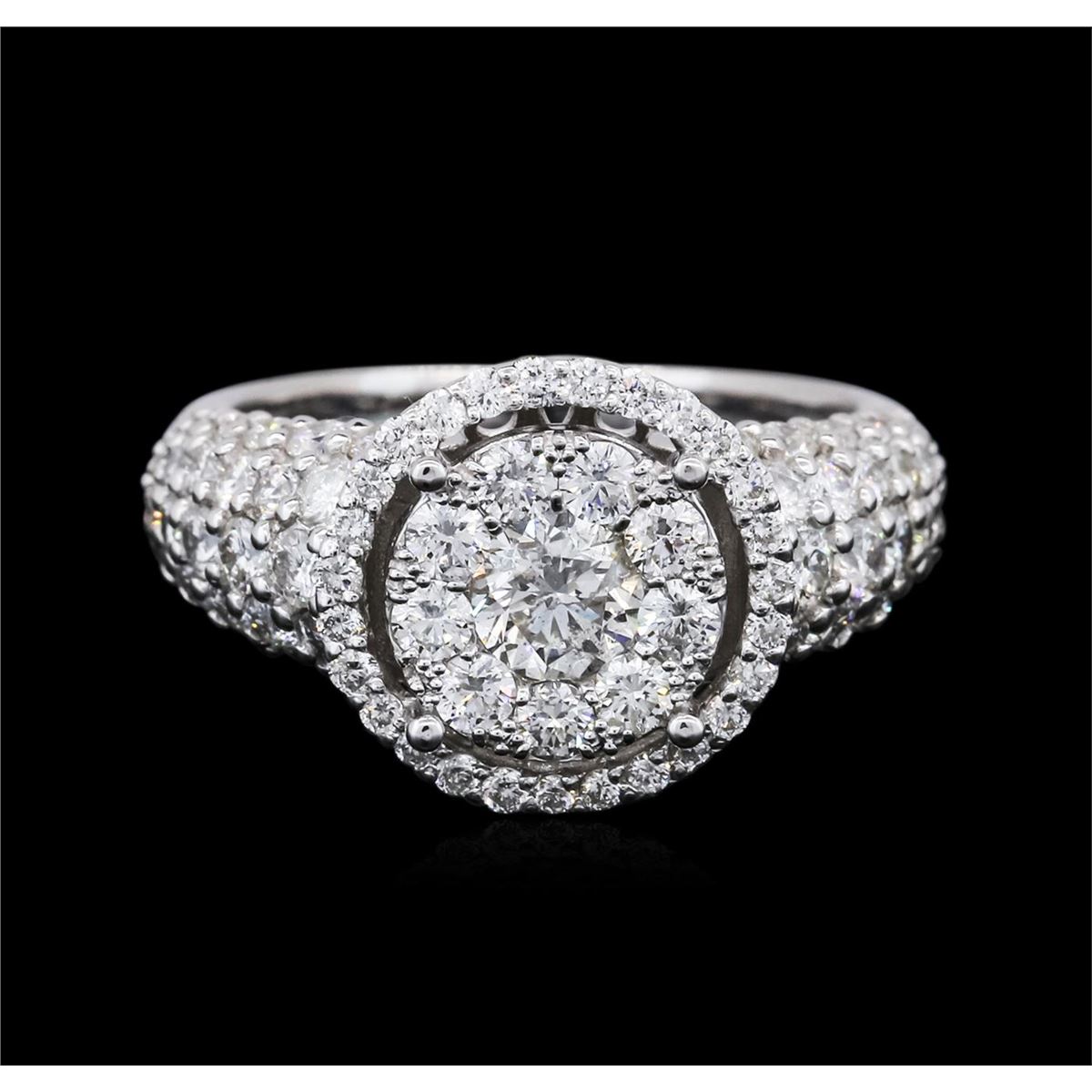 One electronically tested 14KT white gold ladies cast diamond ring with a bright polish finish. The ring features an organized diamond cluster set within a diamond bezel supported by diamond set shoulders, completed by a three millimeter wide band. Identified with markings of "14K". Condition is new, good workmanship. Containing: One prong set round brilliant cut diamond, measuring 4.90 - 4.80 x 3.00mm (depth est.) approximate weight of 0.45ct. Graded in the setting. Clarity: I-1. Color: H Sixty-Five prong set round brilliant cut diamonds, measuring 2.00 - 1.90 x 1.17mm (depth est.) approximate total weight of 65 Stones = 1.85ct. Graded in the setting. Clarity: SI-1 to I-1. Color: G - I Twenty-Seven prong set round brilliant cut diamonds, measuring 1.40 - 1.30 x 0.81mm (depth est.) approximate total weight of 27 Stones = 0.35ct. Graded in the setting. Clarity: SI-1 to I-1. Color: G - I. Total Weight of Diamonds 2.65ct. Total Weight of Ring 6.61 grams. AIG Appraised at $9,040.00.