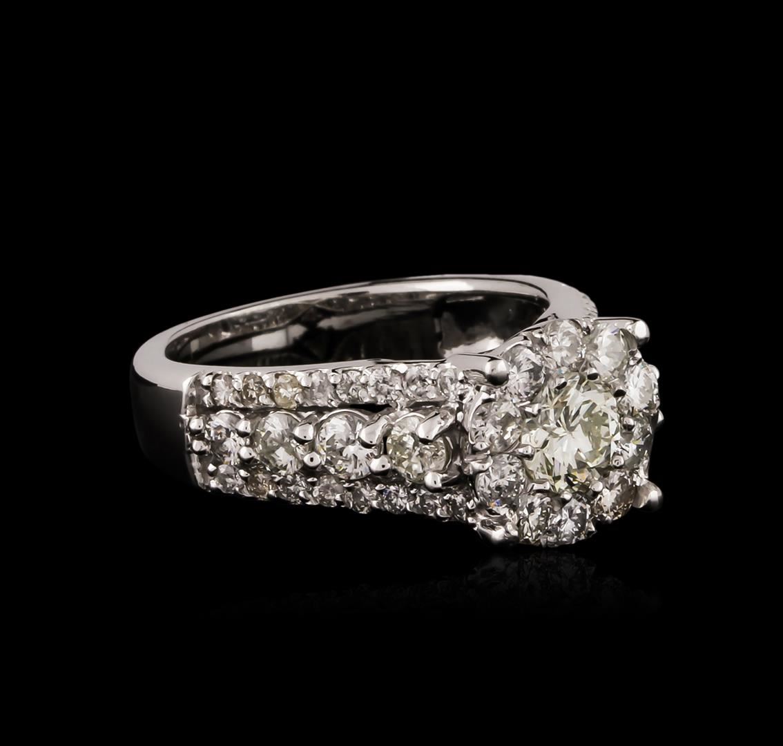 One electronically tested 14KT white gold ladies cast diamond unity ring with a bright polish finish. The featured diamond is set within a diamond bezel supported by tapering diamond set shoulders, completed by a three and one-half millimeter wide band. Identified with markings of "585". Condition is new, good workmanship. Containing: One prong set round brilliant cut diamond, measuring 5.50 - 5.40 x 3.10mm (depth est.) approximate weight of 0.58ct with a faint blue fluorescence. Graded in the setting. Clarity: I-1. Color: K Eighteen prong set round brilliant cut diamonds, measuring 3.10 - 2.50 x 1.68mm (depth est.) approximate total weight of 18 Stones = 1.45ct. Graded in the setting. Clarity: SI-2 to I-2. Color: H - J Thirty-Two prong set round brilliant cut diamonds, measuring 1.70 - 1.60 x 0.99mm (depth est.) approximate total weight of 32 Stones = 0.62ct. Graded in the setting. Clarity: SI-2 to I-2. Color: H - J. Total Weight of Diamonds 2.65ct. Total Weight of Ring 6.53 grams. AIG Appraised at $8,595.00.