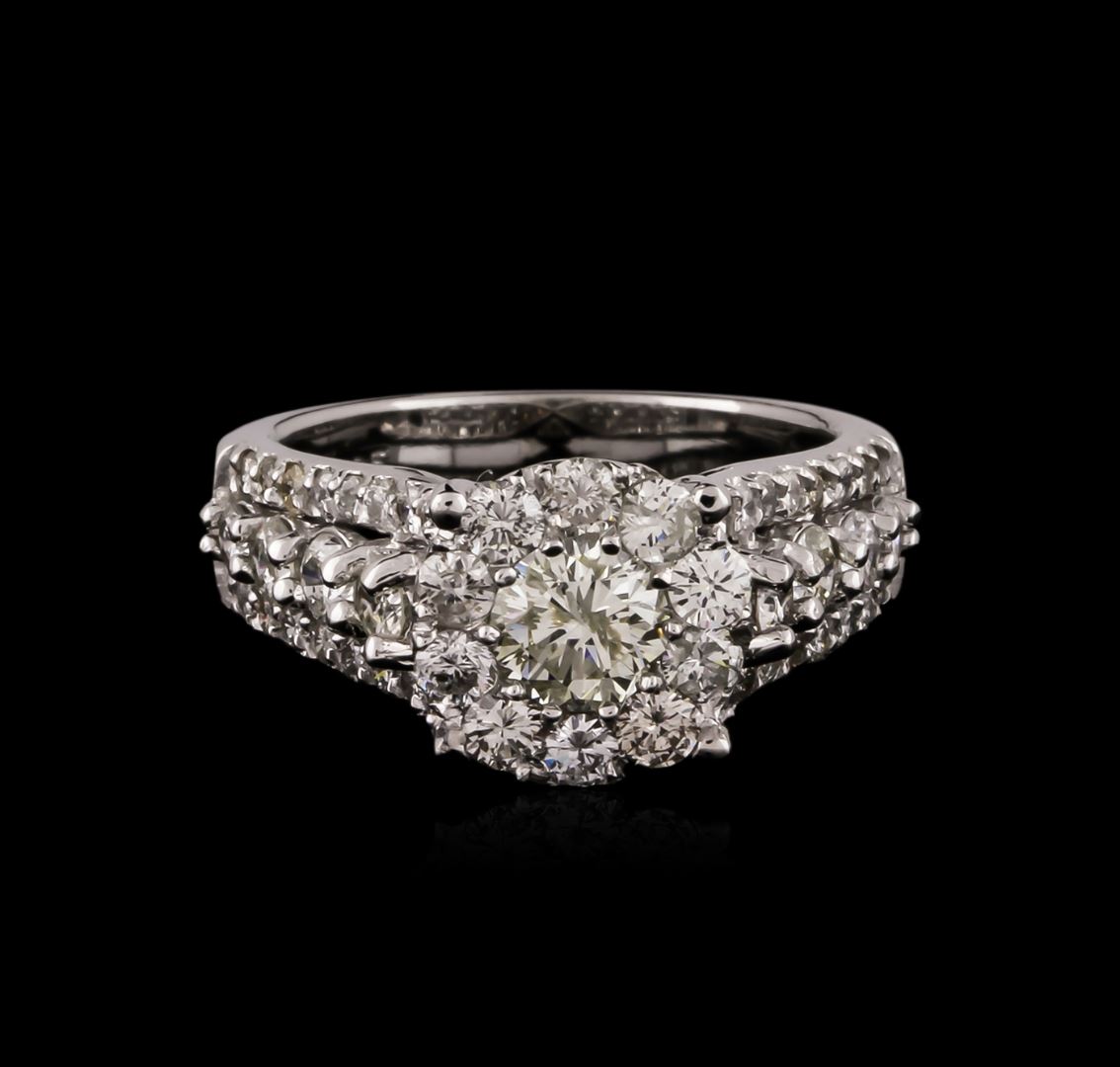 One electronically tested 14KT white gold ladies cast diamond unity ring with a bright polish finish. The featured diamond is set within a diamond bezel supported by tapering diamond set shoulders, completed by a three and one-half millimeter wide band. Identified with markings of "585". Condition is new, good workmanship. Containing: One prong set round brilliant cut diamond, measuring 5.50 - 5.40 x 3.10mm (depth est.) approximate weight of 0.58ct with a faint blue fluorescence. Graded in the setting. Clarity: I-1. Color: K Eighteen prong set round brilliant cut diamonds, measuring 3.10 - 2.50 x 1.68mm (depth est.) approximate total weight of 18 Stones = 1.45ct. Graded in the setting. Clarity: SI-2 to I-2. Color: H - J Thirty-Two prong set round brilliant cut diamonds, measuring 1.70 - 1.60 x 0.99mm (depth est.) approximate total weight of 32 Stones = 0.62ct. Graded in the setting. Clarity: SI-2 to I-2. Color: H - J. Total Weight of Diamonds 2.65ct. Total Weight of Ring 6.53 grams. AIG Appraised at $8,595.00.