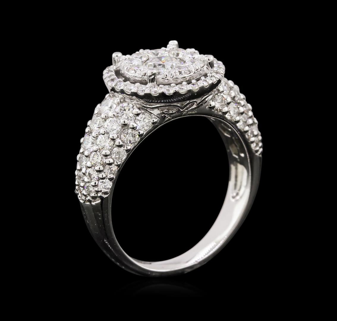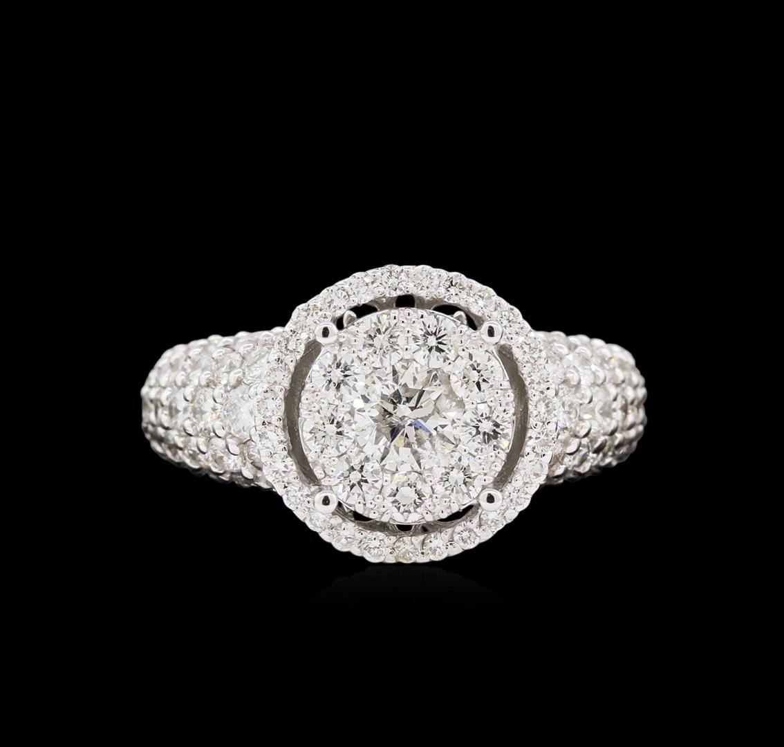 One electronically tested 14KT white gold ladies cast diamond ring with a bright polish finish. The ring features an organized diamond cluster set within a diamond bezel supported by diamond set shoulders, completed by a three millimeter wide band. Identified with markings of "14K". Condition is new, good workmanship. Containing: One prong set round brilliant cut diamond, measuring 4.90 - 4.80 x 3.00mm (depth est.) approximate weight of 0.45ct. Graded in the setting. Clarity: I-1. Color: H Sixty-Five prong set round brilliant cut diamonds, measuring 2.00 - 1.90 x 1.17mm (depth est.) approximate total weight of 65 Stones = 1.85ct. Graded in the setting. Clarity: SI-1 to I-1. Color: G - I Twenty-Seven prong set round brilliant cut diamonds, measuring 1.40 - 1.30 x 0.81mm (depth est.) approximate total weight of 27 Stones = 0.35ct. Graded in the setting. Clarity: SI-1 to I-1. Color: G - I. Total Weight of Diamonds 2.65ct. Total Weight of Ring 6.61 grams. AIG Appraised at $9,040.00.