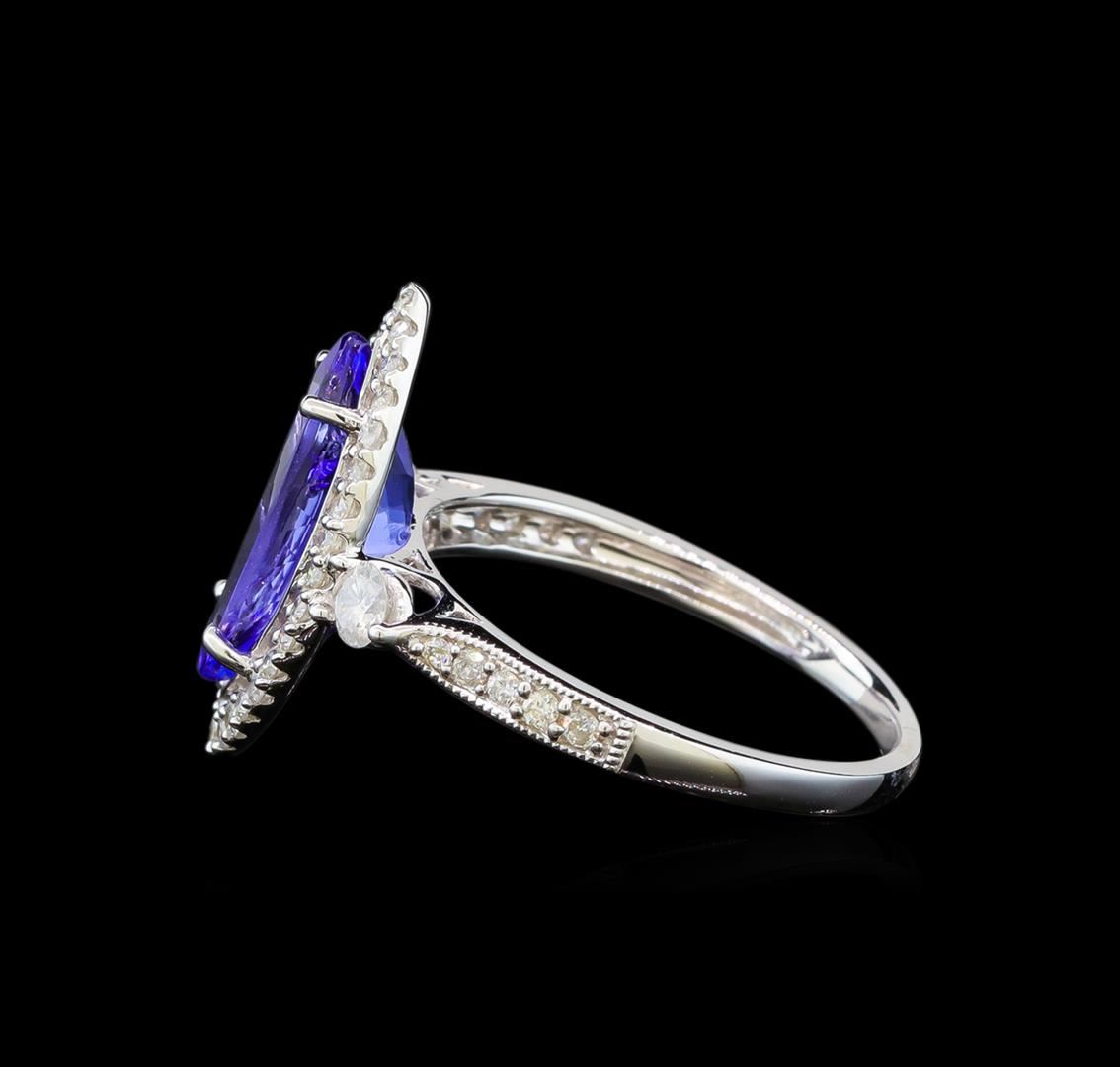 One electronically tested 14KT white gold ladies cast tanzanite and diamond ring with a bright polish finish. Identified with markings of "14K". Condition is new. Containing: One prong set marquise modified brilliant cut natural tanzanite, measuring 13.10 x 6.36 x 5.02mm, approximate weight of 2.66ct., clarity is eye clean, type I, medium, very slightly grayish, violet color, (GIA V 5/3), cut is good. Two prong set round brilliant cut diamonds, measuring 2.90 - 2.90 x 1.74mm (depth est.) approximate total weight of 2 Stones = 0.18ct. Clarity: SI-1. Color: I - J. Forty-Three prong set round brilliant cut diamonds, measuring 1.20 - 1.20 x 0.72mm (depth est.) approximate total weight of 43 Stones = 0.27ct. Clarity: I-1 to I-2. Color: H - I, Cut is Good. Colored gemstones are presumed to have been subjected to commonly used enhancement processes. All diamonds and colored gemstones are graded in the mounting, unless otherwise stated. Total Weight of Colored Stones 2.66ct. Total Weight of Diamonds 0.45ct. Total Weight of Ring 2.90 grams. GGL Appraised at $2,725.00.