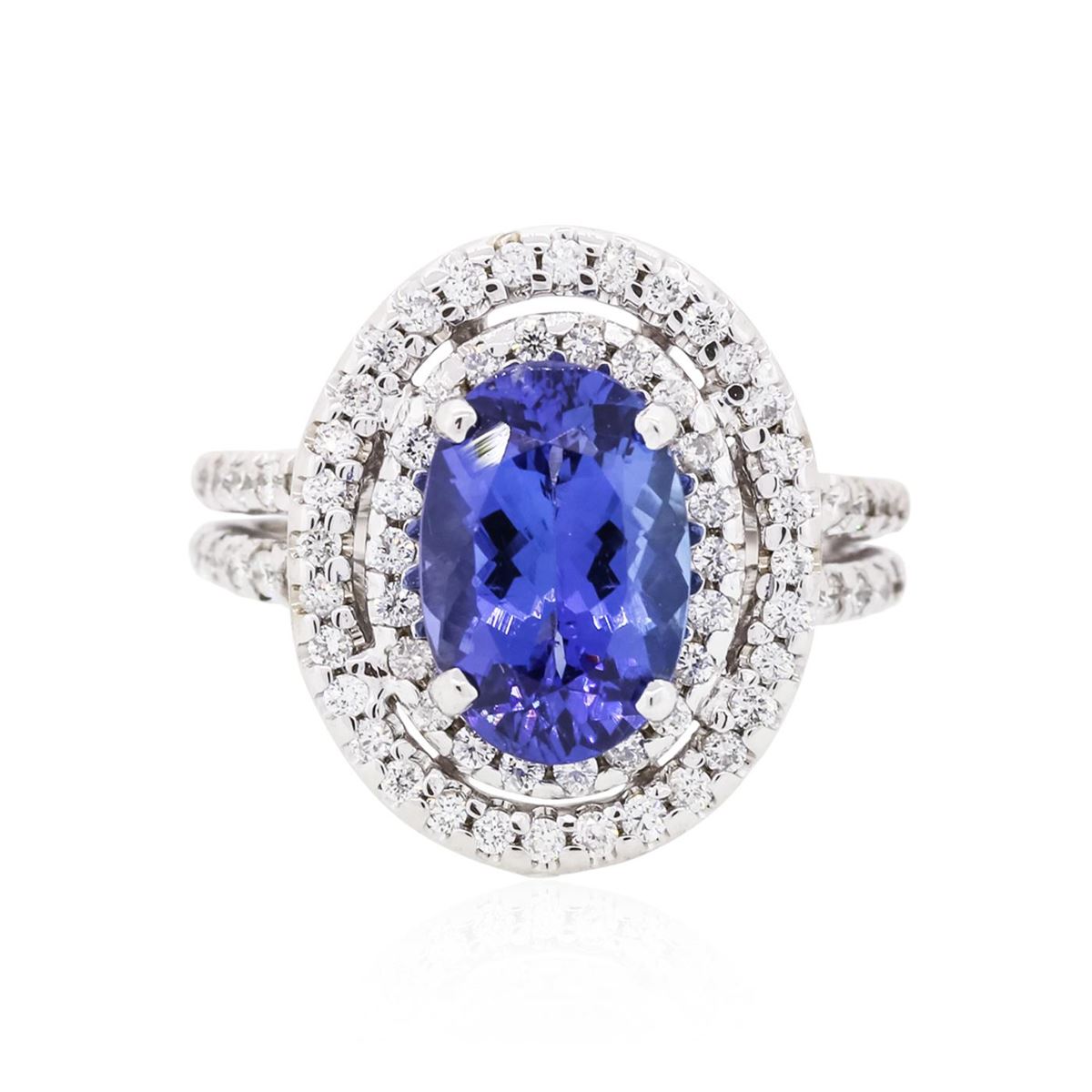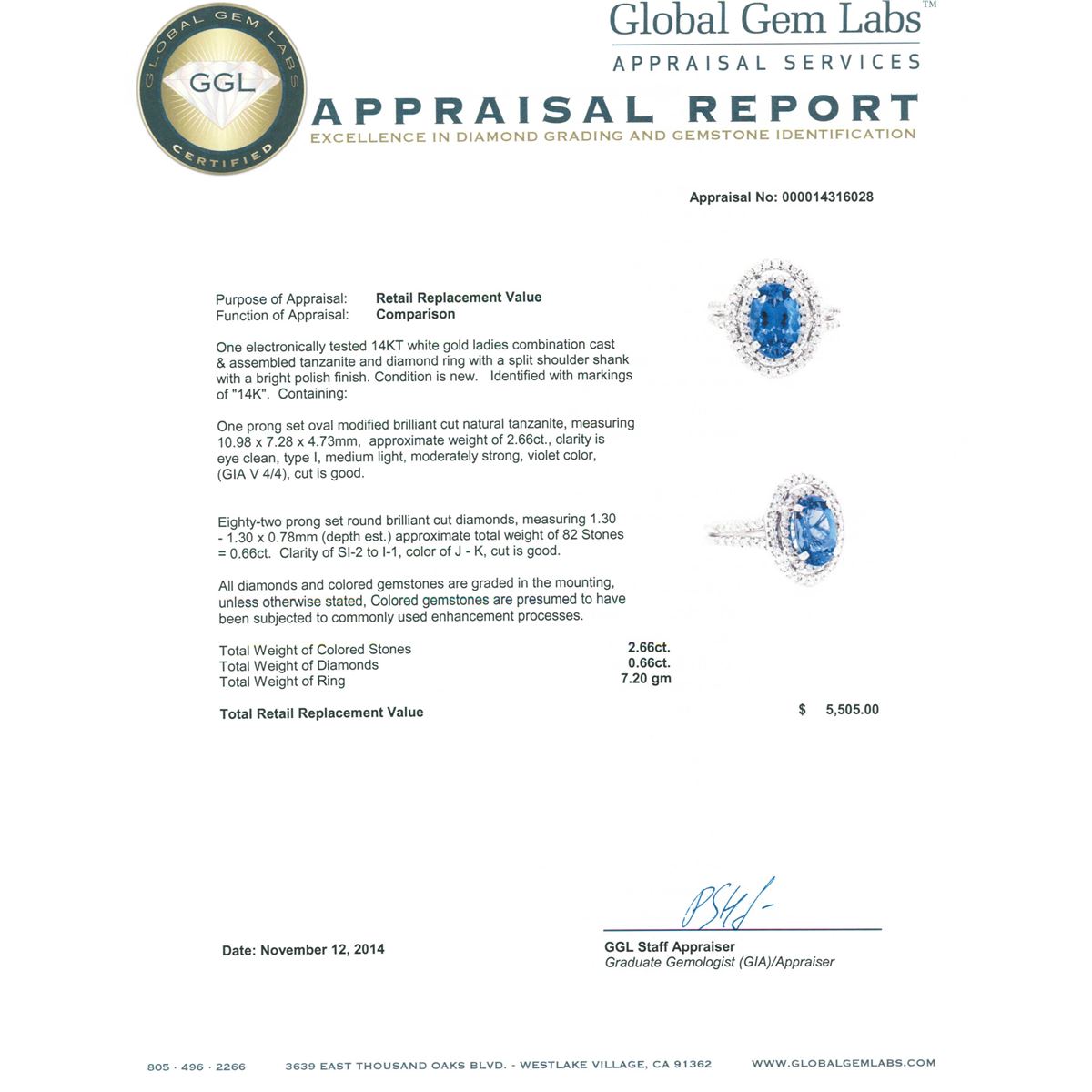 One electronically tested 14KT white gold ladies combination cast & assembled tanzanite and diamond ring with a split shoulder shank with a bright polish finish. Identified with markings of "14K". Condition is new. Containing: One prong set oval modified brilliant cut natural tanzanite, measuring 10.98 x 7.28 x 4.73mm, approximate weight of 2.66ct., clarity is eye clean, type I, medium light, moderately strong, violet color, (GIA V 4/4), cut is good. Eighty-Two prong set round brilliant cut diamonds, measuring 1.30 - 1.30 x 0.78mm (depth est.) approximate total weight of 82 Stones = 0.66ct. Clarity: SI-2 to I-1. Color: J - K, Cut is Good. All diamonds and colored gemstones are graded in the mounting, unless otherwise stated, Colored gemstones are presumed to have been subjected to commonly used enhancement processes. Total Weight of Colored Stones 2.66ct. Total Weight of Diamonds 0.66ct. Total Weight of Ring 7.20 grams. GGL Appraised at $5,505.00.