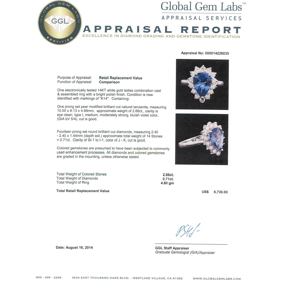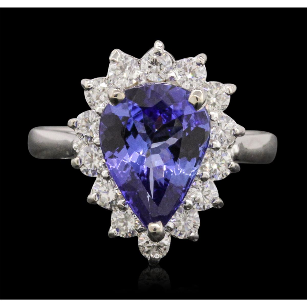 One electronically tested 14KT white gold ladies combination cast & assembled ring with a bright polish finish. Condition is new. Identified with markings of "K14". Containing: One prong set pear modified brilliant cut natural tanzanite, measuring 10.00 x 8.13 x 4.89mm, approximate weight of 2.66ct., clarity is eye clean, type I, medium, moderately strong, bluish violet color, (GIA bV 5/4), cut is good. Fourteen prong set round brilliant cut diamonds, measuring 2.40 - 2.40 x 1.44mm (depth est.) approximate. Total Weight of 14 Stones = 0.71ct. Clarity: SI-1 to I-1. Color: J - K, Cut is Good. Colored gemstones are presumed to have been subjected to commonly used enhancement processes. All diamonds and colored gemstones are graded in the mounting, unless otherwise stated. Total Weight of Colored Stones 2.66ct. Total Weight of Diamonds 0.71ct. Total Weight of Ring 4.80 grams. GGL Appraised at $6,730.00.