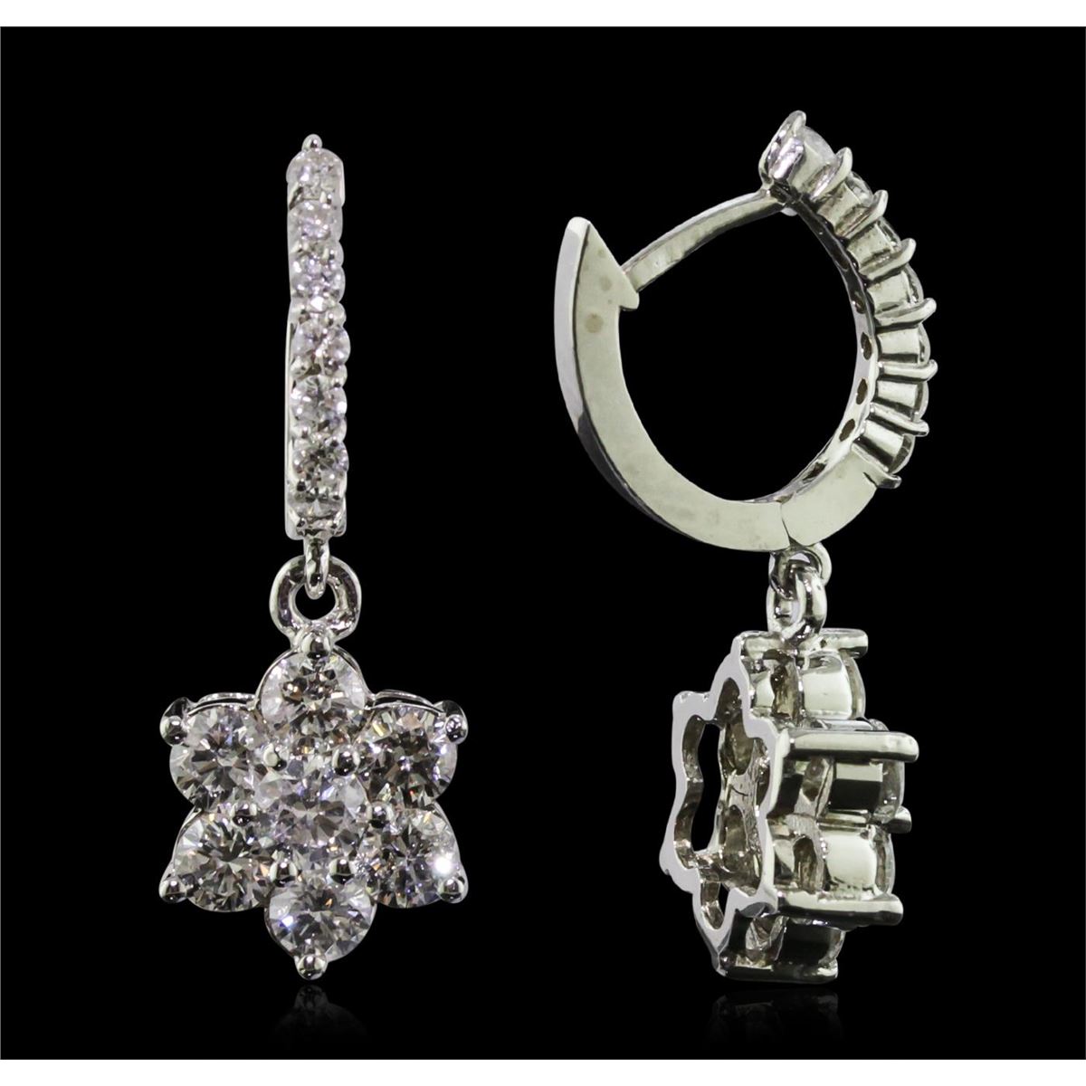 One pair electronically tested 14KT white gold ladies combination cast & assembled diamond earrings with hinged clip backs with a bright polish finish. Identified with markings of "14K". Condition is new. Containing: Fourteen prong set round brilliant cut diamonds, measuring 4.00 - 3.50 x 2.25mm (depth est.) approximate total weight of 14 Stones = 2.40ct. Clarity: SI-1 to SI-2. Color: I - J, Cut is Good. Twelve prong set round brilliant cut diamonds, measuring 1.80 - 1.80 x 1.08mm (depth est.) approximate total weight of 12 Stones = 0.26ct. Clarity: I-1. Color: H - I, Cut is Good. All diamonds are graded in the mounting, unless otherwise stated. Total Weight of Diamonds 2.66ct. Total Weight of Earrings 6.90 grams. GGL Appraised at $12,145.00.