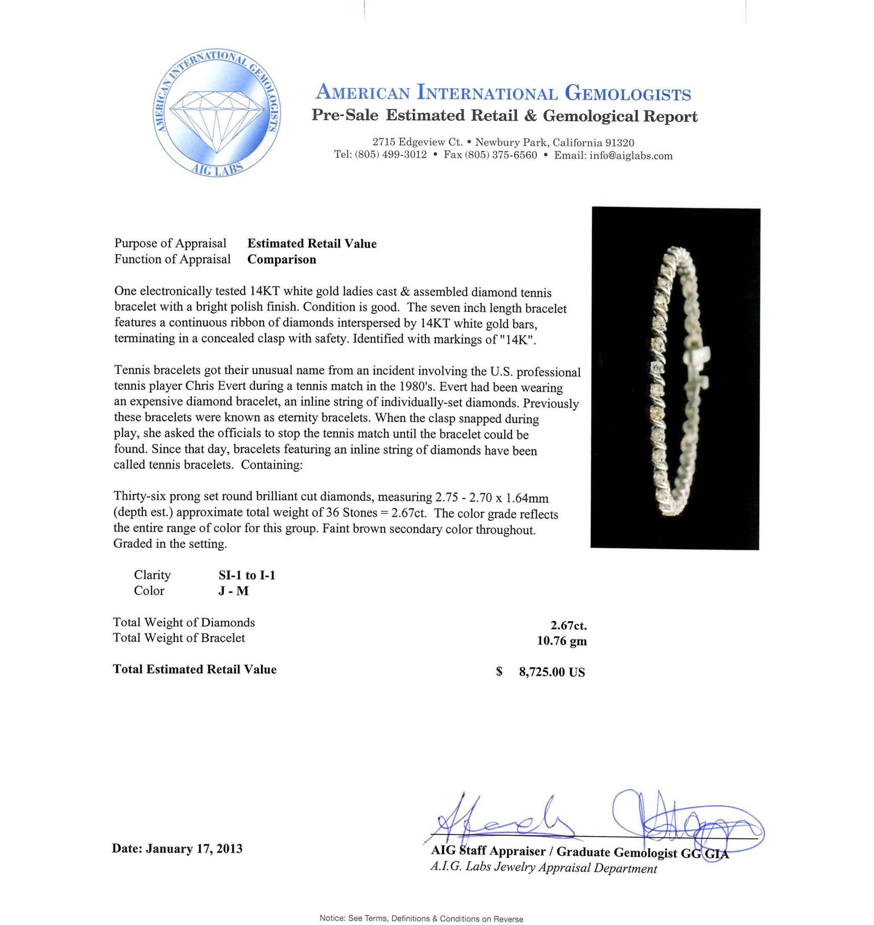 One electronically tested 14KT white gold ladies cast & assembled diamond tennis bracelet with a bright polish finish. Condition is good. The seven inch length bracelet features a continuous ribbon of diamonds interspersed by 14KT white gold bars, terminating in a concealed clasp with safety. Identified with markings of "14K". Tennis bracelet got their unusual name from an incident involving the U.S. professional tennis player Chris Evert during a tennis match in the 1980's. Evert had been wearing an expensive diamond bracelet, an inline string of individually-set diamonds. Previously these bracelets were known as eternity bracelets. When the clasp snapped during play, she asked the officials to stop the tennis match until the bracelet could be found. Since that day, bracelets featuring an inline string of diamonds have been called tennis bracelets. Containing: Thirty-six prong set round brilliant cut diamonds, measuring 2.75 -- 2.70 x 1.64mm (depth est.) approximate total weight of 36 Stones = 2.67ct. The color grade reflects the entire range of color for this group. Faint brown secondary color throughout. Graded in the setting. Clarity SI-1 to I-1. Color J -- M. Total Weight of Diamonds.2.67ct. Total Weight of Bracelet 10.76 gm. AIG Appraised at $8,725.00.