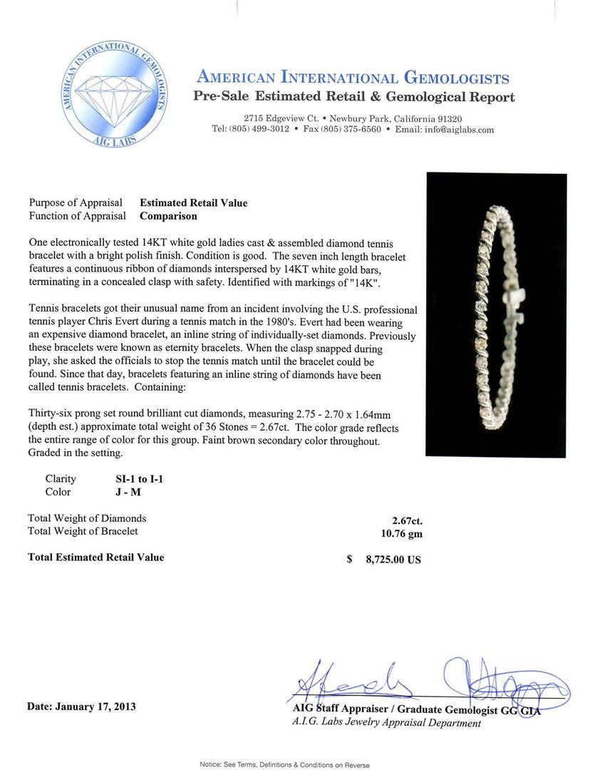 One electronically tested 14KT white gold ladies cast & assembled diamond tennis bracelet with a bright polish finish. Condition is good. The seven inch length bracelet features a continuous ribbon of diamonds interspersed by 14KT white gold bars, terminating in a concealed clasp with safety. Identified with markings of "14K". Tennis bracelet got their unusual name from an incident involving the U.S. professional tennis player Chris Evert during a tennis match in the 1980's. Evert had been wearing an expensive diamond bracelet, an inline string of individually-set diamonds. Previously these bracelets were known as eternity bracelets. When the clasp snapped during play, she asked the officials to stop the tennis match until the bracelet could be found. Since that day, bracelets featuring an inline string of diamonds have been called tennis bracelets. Containing: Thirty-six prong set round brilliant cut diamonds, measuring 2.75 -- 2.70 x 1.64mm (depth est.) approximate total weight of 36 Stones = 2.67ct. The color grade reflects the entire range of color for this group. Faint brown secondary color throughout. Graded in the setting. Clarity SI-1 to I-1. Color J -- M. Total Weight of Diamonds.2.67ct. Total Weight of Bracelet 10.76 gm. AIG Appraised.