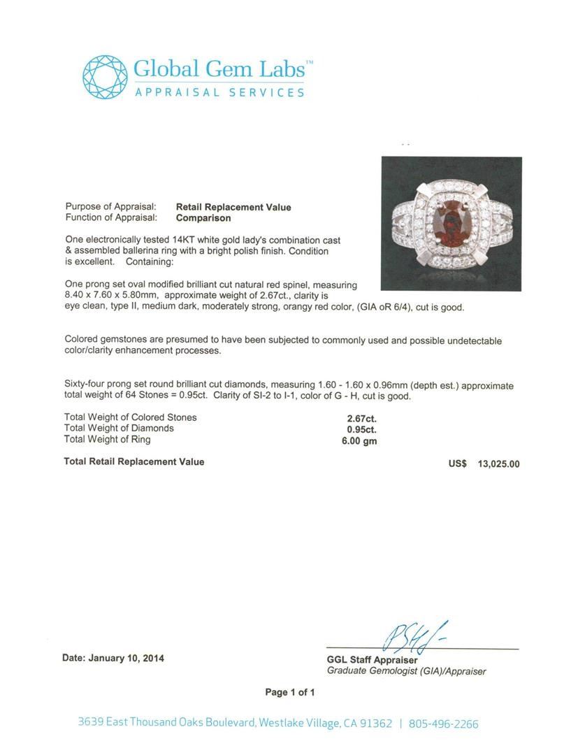 One electronically tested 14KT white gold Ladies combination cast & assembled ballerina ring with a bright polish finish. Condition is excellent. Containing: One prong set oval modified brilliant cut natural red spinel, measuring 8.40 x 7.60 x 5.80mm, approximate weight of 2.67ct., clarity is eye clean, type II, medium dark, moderately strong, orangy red color, (GIA oR 6/4), cut is good. Colored gemstones are presumed to have been subjected to commonly used and possible undetectable color/clarity enhancement processes. Sixty-Four prong set round brilliant cut diamonds, measuring 1.60 - 1.60 x 0.96mm (depth est.) approximate total weight of 64 Stones = 0.95ct. Clarity of SI-2 to I-1, Color of G - H, Cut is Good. Total Weight of Colored Stones 2.67ct. Total Weight of Diamonds 0.95ct. Total Weight of Ring 6.00gm. GGL Appraised.