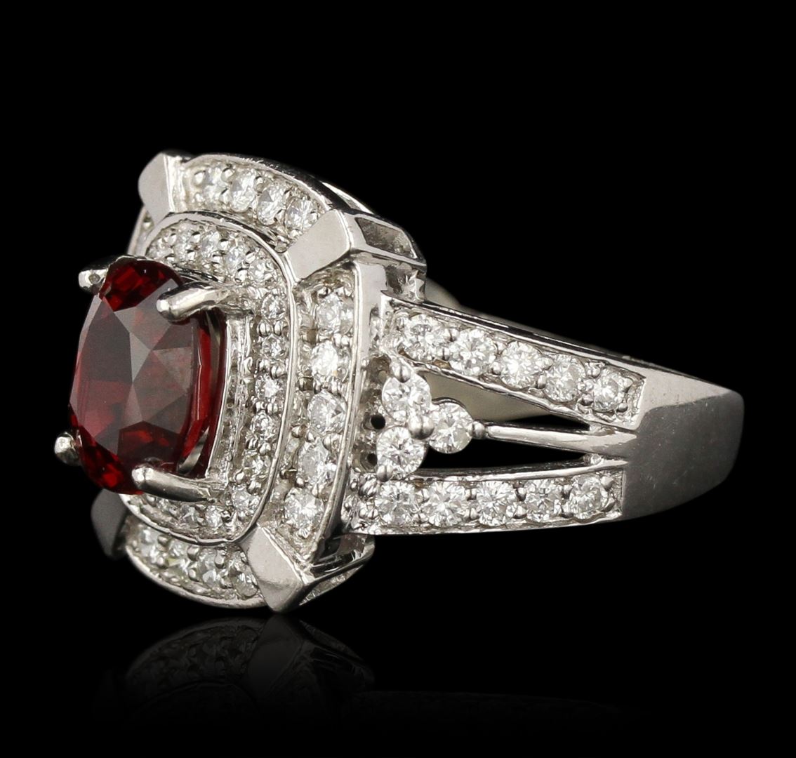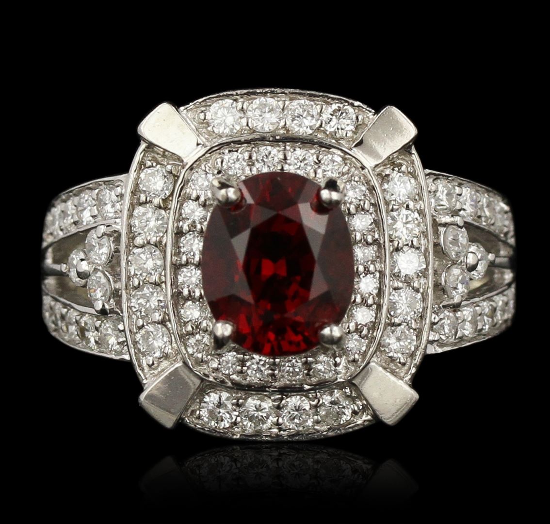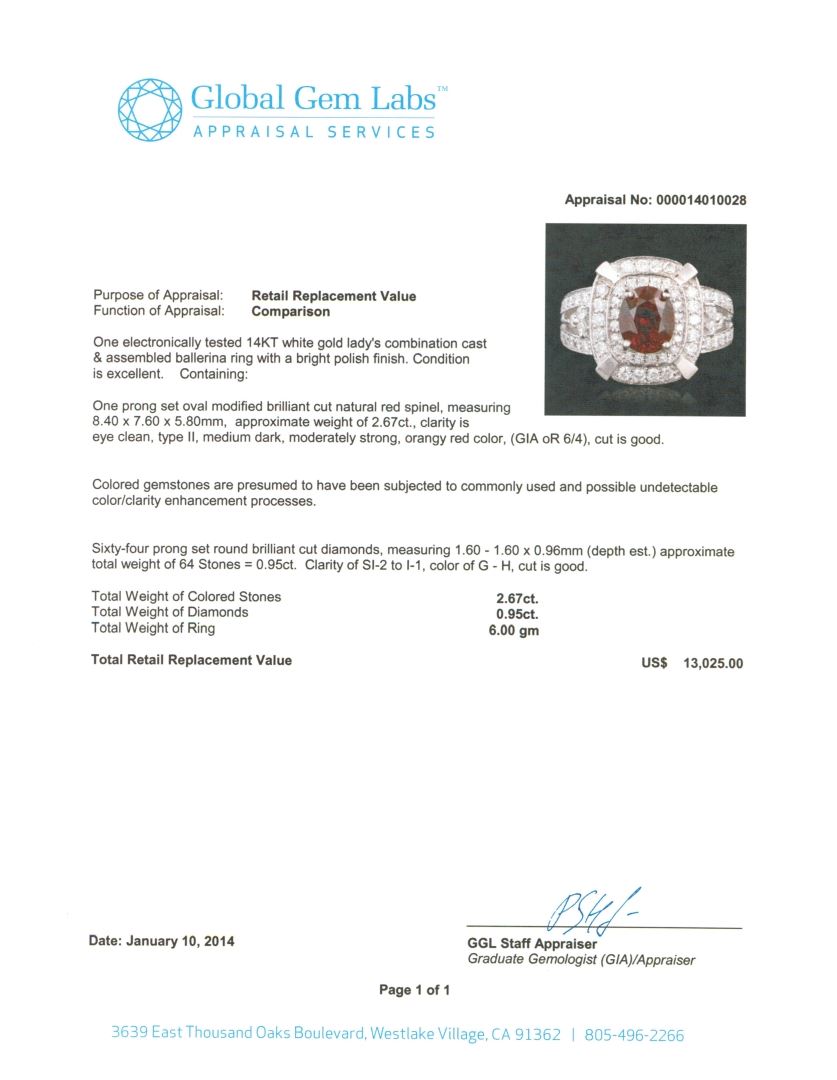 One electronically tested 14KT white gold Ladies combination cast & assembled ballerina ring with a bright polish finish. Condition is excellent. Containing: One prong set oval modified brilliant cut natural red spinel, measuring 8.40 x 7.60 x 5.80mm, approximate weight of 2.67ct., clarity is eye clean, type II, medium dark, moderately strong, orangy red color, (GIA oR 6/4), cut is good. Colored gemstones are presumed to have been subjected to commonly used and possible undetectable color/clarity enhancement processes. Sixty-Four prong set round brilliant cut diamonds, measuring 1.60 - 1.60 x 0.96mm (depth est.) approximate total weight of 64 Stones = 0.95ct. Clarity of SI-2 to I-1, Color of G - H, Cut is Good. Total Weight of Colored Stones 2.67ct. Total Weight of Diamonds 0.95ct. Total Weight of Ring 6.00gm. GGL Appraised at $13,025.00.