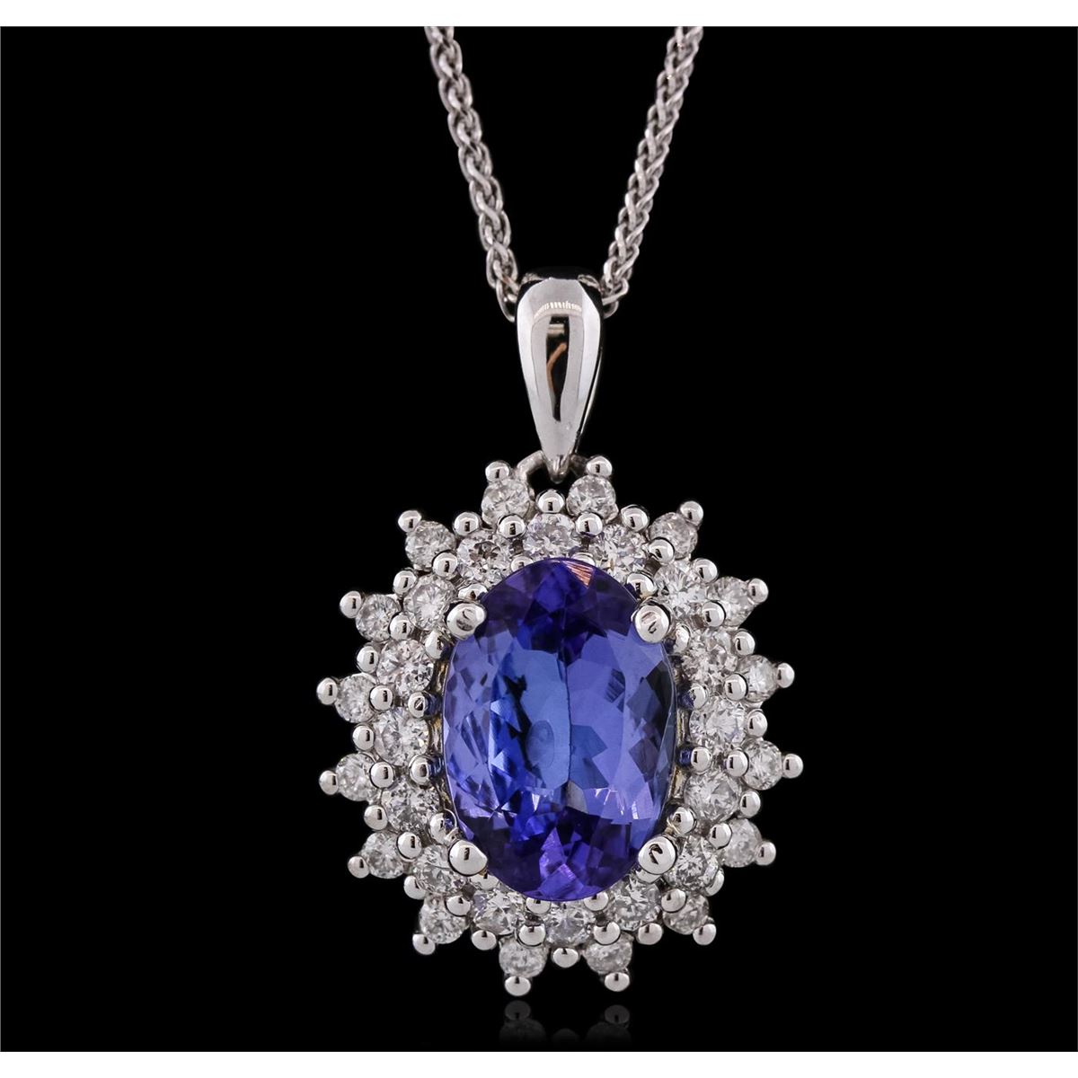 One electronically tested 14KT white gold ladies combination cast & assembled pendant & chain 18.0" long, medium cable link with a lobster claw clasp with a bright polish finish. Identified with markings of "14K". Condition is new. Containing: One prong set oval modified brilliant cut natural tanzanite, measuring 10.77 x 7.41 x 4.82mm, approximate weight of 2.67ct., clarity is eye clean, type I, medium light, very slightly grayish, violet color, (GIA V 4/3), cut is good. Thirty-Two prong set round brilliant cut diamonds, measuring 1.90 - 1.50 x 1.02mm (depth est.) approximate total weight of 32 Stones = 0.57ct. . Clarity: I-1 to I-2. Color: I - J, Cut is Good. Colored gemstones are presumed to have been subjected to commonly used enhancement processes. All diamonds and colored gemstones are graded in the mounting, unless otherwise stated.. Total Weight of Colored Stones 2.67ct.. Total Weight of Diamonds 0.57ct.. Total Weight of Pendant & Chain 6.00 grams. GGL Appraised at $6,695.00.