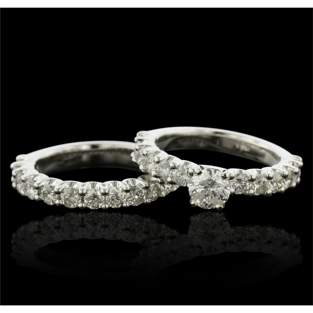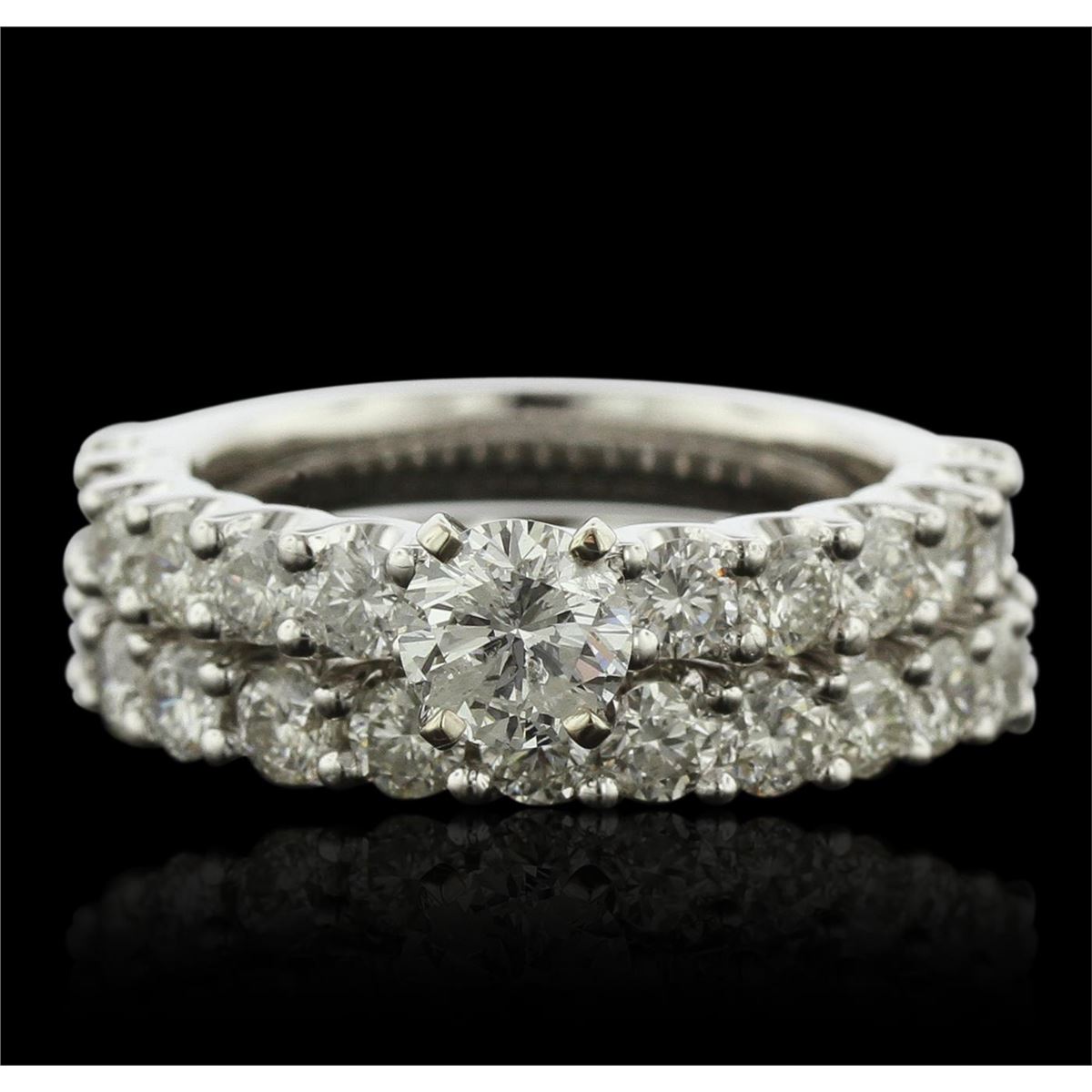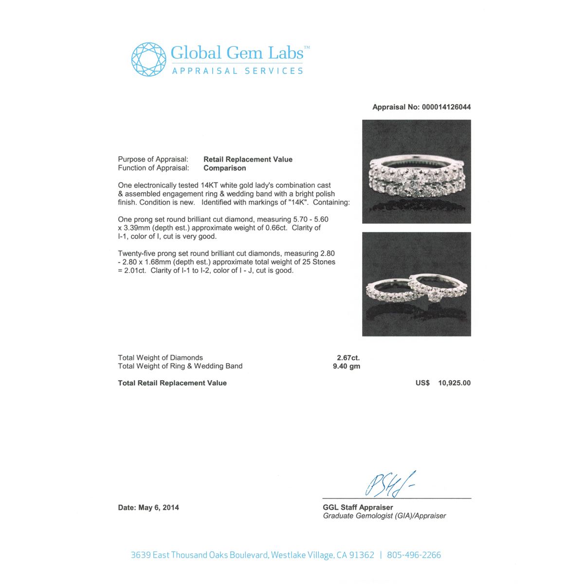 One electronically tested 14KT white gold Ladies combination cast & assembled engagement ring & wedding band with a bright polish finish. Condition is new. Identified with markings of "14K". Containing: One prong set round brilliant cut diamond, measuring 5.70 - 5.60 x 3.39mm (depth est.) approximate weight of 0.66ct. . Clarity: I-1. Color: I, Cut is Very Good. Twenty-Five prong set round brilliant cut diamonds, measuring 2.80 - 2.80 x 1.68mm (depth est.) approximate. Total Weight of 25 Stones = 2.01ct. . Clarity: I-1 to I-2. Color: I - J, Cut is Good. Total Weight of Diamonds 2.67ct. Total Weight of Ring & Wedding Band 9.40 grams. GGL Appraised at $10,925.00.