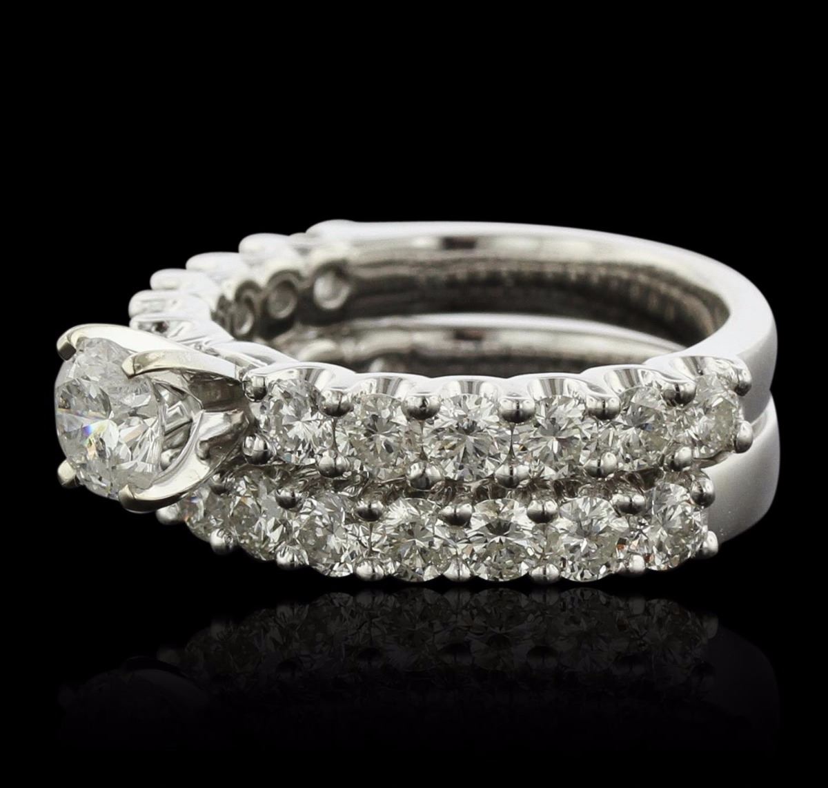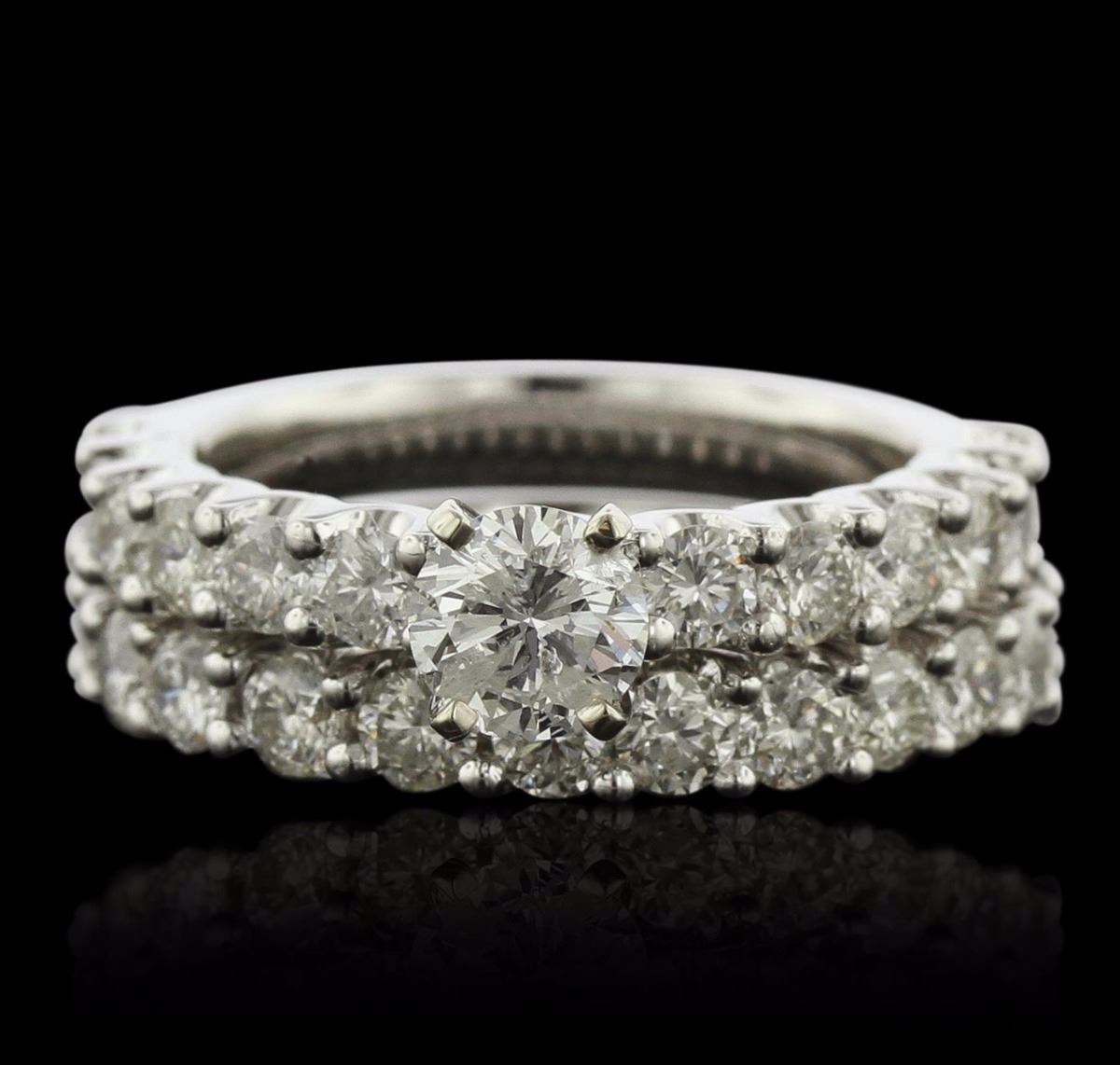One electronically tested 14KT white gold Ladies combination cast & assembled engagement ring & wedding band with a bright polish finish. Condition is new. Identified with markings of "14K". Containing: One prong set round brilliant cut diamond, measuring 5.70 - 5.60 x 3.39mm (depth est.) approximate weight of 0.66ct. . Clarity: I-1. Color: I, Cut is Very Good. Twenty-Five prong set round brilliant cut diamonds, measuring 2.80 - 2.80 x 1.68mm (depth est.) approximate. Total Weight of 25 Stones = 2.01ct. . Clarity: I-1 to I-2. Color: I - J, Cut is Good. Total Weight of Diamonds 2.67ct. Total Weight of Ring & Wedding Band 9.40 grams. GGL Appraised at $10,925.00.