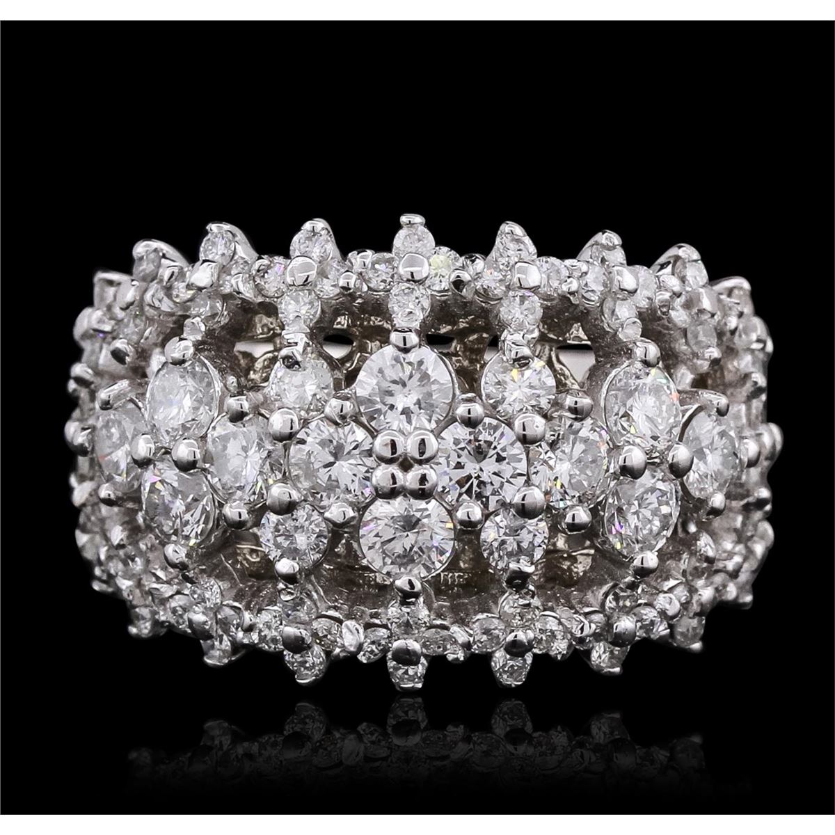 One electronically tested 14KT white gold ladies cast diamond ring with a bright polish finish. The ring features a diamond curvature set within mirroring diamond ribbons supported by split shoulders and an elaborate under gallery, completed by a four millimeter wide band. Identified with markings of "14K". Condition is new, good workmanship. Containing: Twelve prong set round brilliant cut diamonds, measuring 3.30 - 3.20 x 1.95mm (depth est.) approximate total weight of 12 Stones = 1.60ct. Graded in the setting. Clarity: SI-2 to I-1. Color: G - I Four prong set round brilliant cut diamonds, measuring 2.50 - 2.40 x 1.47mm (depth est.) approximate total weight of 4 Stones = 0.25ct. Graded in the setting. Clarity: SI-2 to I-1. Color: G - I Eighty prong set round brilliant cut diamonds, measuring 1.40 - 1.30 x 0.81mm (depth est.) approximate total weight of 80 Stones = 0.82ct. Graded in the setting. Clarity: SI-1 to I-1. Color: G - I. Total Weight of Diamonds 2.67ct. Total Weight of Ring 10.91 grams. AIG Appraised at $10,100.00.
