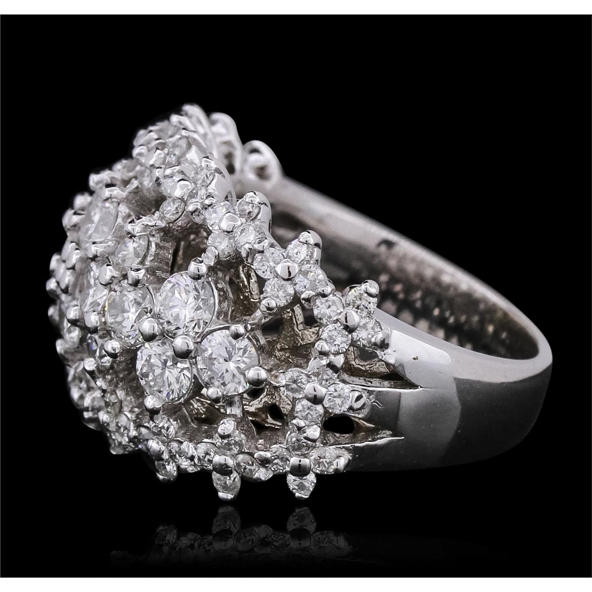 One electronically tested 14KT white gold ladies cast diamond ring with a bright polish finish. The ring features a diamond curvature set within mirroring diamond ribbons supported by split shoulders and an elaborate under gallery, completed by a four millimeter wide band. Identified with markings of "14K". Condition is new, good workmanship. Containing: Twelve prong set round brilliant cut diamonds, measuring 3.30 - 3.20 x 1.95mm (depth est.) approximate total weight of 12 Stones = 1.60ct. Graded in the setting. Clarity: SI-2 to I-1. Color: G - I Four prong set round brilliant cut diamonds, measuring 2.50 - 2.40 x 1.47mm (depth est.) approximate total weight of 4 Stones = 0.25ct. Graded in the setting. Clarity: SI-2 to I-1. Color: G - I Eighty prong set round brilliant cut diamonds, measuring 1.40 - 1.30 x 0.81mm (depth est.) approximate total weight of 80 Stones = 0.82ct. Graded in the setting. Clarity: SI-1 to I-1. Color: G - I. Total Weight of Diamonds 2.67ct. Total Weight of Ring 10.91 grams. AIG Appraised at $10,100.00.