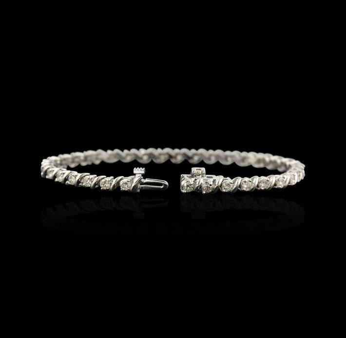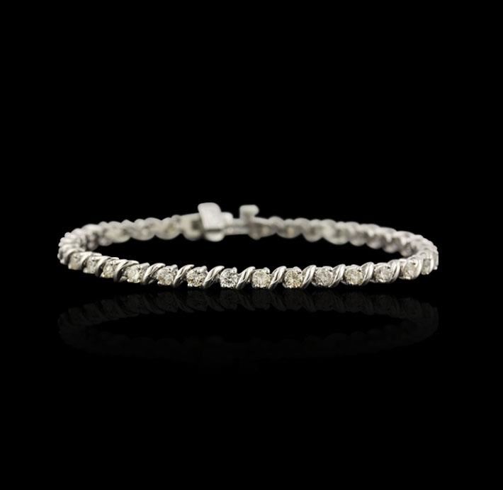 One electronically tested 14KT white gold ladies cast & assembled diamond tennis bracelet with a bright polish finish. Condition is good. The seven inch length bracelet features a continuous ribbon of diamonds interspersed by 14KT white gold bars, terminating in a concealed clasp with safety. Identified with markings of "14K". Tennis bracelet got their unusual name from an incident involving the U.S. professional tennis player Chris Evert during a tennis match in the 1980's. Evert had been wearing an expensive diamond bracelet, an inline string of individually-set diamonds. Previously these bracelets were known as eternity bracelets. When the clasp snapped during play, she asked the officials to stop the tennis match until the bracelet could be found. Since that day, bracelets featuring an inline string of diamonds have been called tennis bracelets. Containing: Thirty-six prong set round brilliant cut diamonds, measuring 2.75 -- 2.70 x 1.64mm (depth est.) approximate total weight of 36 Stones = 2.67ct. The color grade reflects the entire range of color for this group. Faint brown secondary color throughout. Graded in the setting. Clarity SI-1 to I-1. Color J -- M. Total Weight of Diamonds.2.67ct. Total Weight of Bracelet 10.76 gm. AIG Appraised at $8,725.00.