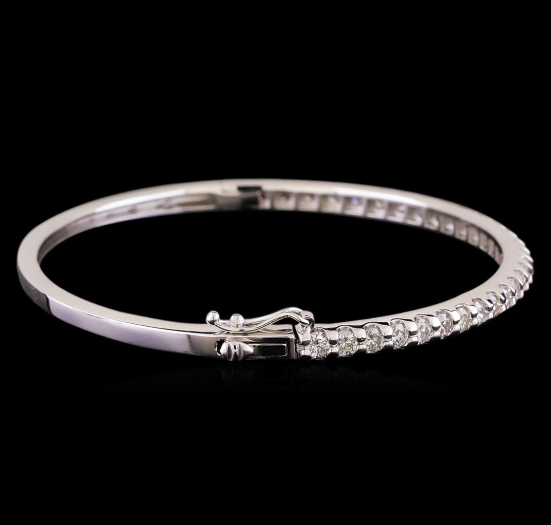 One electronically tested 14KT white gold ladies cast diamond bangle bracelet with a hidden box clasp with safety closer with a bright polish finish. Identified with markings of "K14". Condition is new. Containing: Thirty prong set round brilliant cut diamonds, measuring 2.90 - 2.90 x 1.74mm (depth est.) approximate total weight of 30 Stones = 2.68ct. Clarity: SI-2 to I-1. Color: J - K, Cut is Good. All diamonds are graded in the mounting, unless otherwise stated. Total Weight of Diamonds 2.68ct. Total Weight of Bangle Bracelet 14.50 grams. GGL Appraised at $10,080.00.