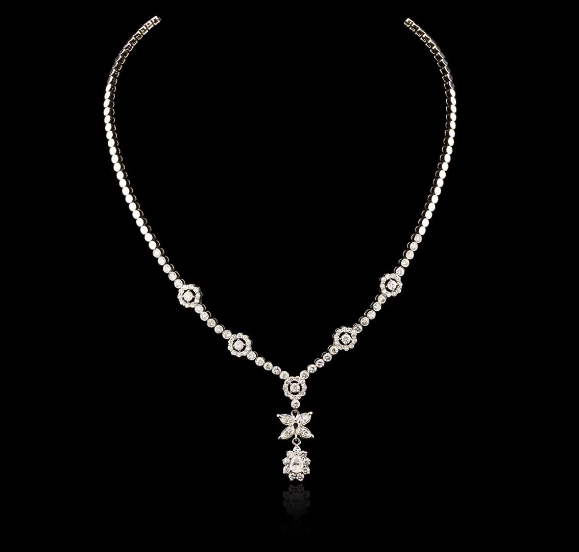 One electronically tested 14KT white gold ladies cast diamond necklace with a hidden box clasp with a bright polish finish. Measurements: 14" in length Condition is new. Containing: One prong set pear shaped cut diamond, measuring 6.20 x 3.80 x 2.40mm (depth est.) approximate weight of 0.33ct. Clarity: I-2. Color: G, Cut is Good. Four bezel set marquise shaped cut diamonds, measuring 4.50 x 3.00 x 1.89mm (depth est.) approximate total weight of 4 Stones = 0.58ct. Clarity: SI-1. Color: H - I, Cut is Good. Five prong set round brilliant cut diamonds, measuring 2.90 - 2.90 x 1.74mm (depth est.) approximate total weight of 5 Stones = 0.45ct. Clarity: SI-2 to I-1. Color: H - I, Cut is Good. Eighty-One prong set round brilliant cut diamonds, measuring 2.00 - 1.30 x 0.99mm (depth est.) approximate total weight of 81 Stones = 1.33ct. Clarity: SI-1 to I-1. Color: H - J, Cut is Good. All diamonds are graded in the mounting, unless otherwise stated. Total Weight of Diamonds 2.68ct. Total Weight of Necklace 17.20 grams. GGL Appraised at $11,415.00.
