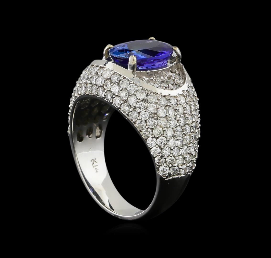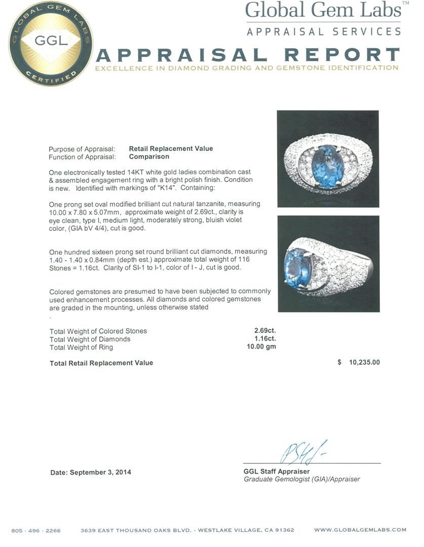 One electronically tested 14KT white gold ladies combination cast & assembled engagement ring with a bright polish finish. Identified with markings of "K14". Condition is new. Containing: One prong set oval modified brilliant cut natural tanzanite, measuring 10.00 x 7.80 x 5.07mm, approximate weight of 2.69ct., clarity is eye clean, type I, medium light, moderately strong, bluish violet color, (GIA bV 4/4), cut is good. One Hundred Sixteen prong set round brilliant cut diamonds, measuring 1.40 - 1.40 x 0.84mm (depth est.) approximate total weight of 116 Stones = 1.16ct. Clarity: SI-1 to I-1. Color: I - J, Cut is Good. Colored gemstones are presumed to have been subjected to commonly used enhancement processes. All diamonds and colored gemstones are graded in the mounting, unless otherwise stated. Total Weight of Colored Stones 2.69ct. Total Weight of Diamonds 1.16ct. Total Weight of Ring 10.00 grams. GGL Appraised.