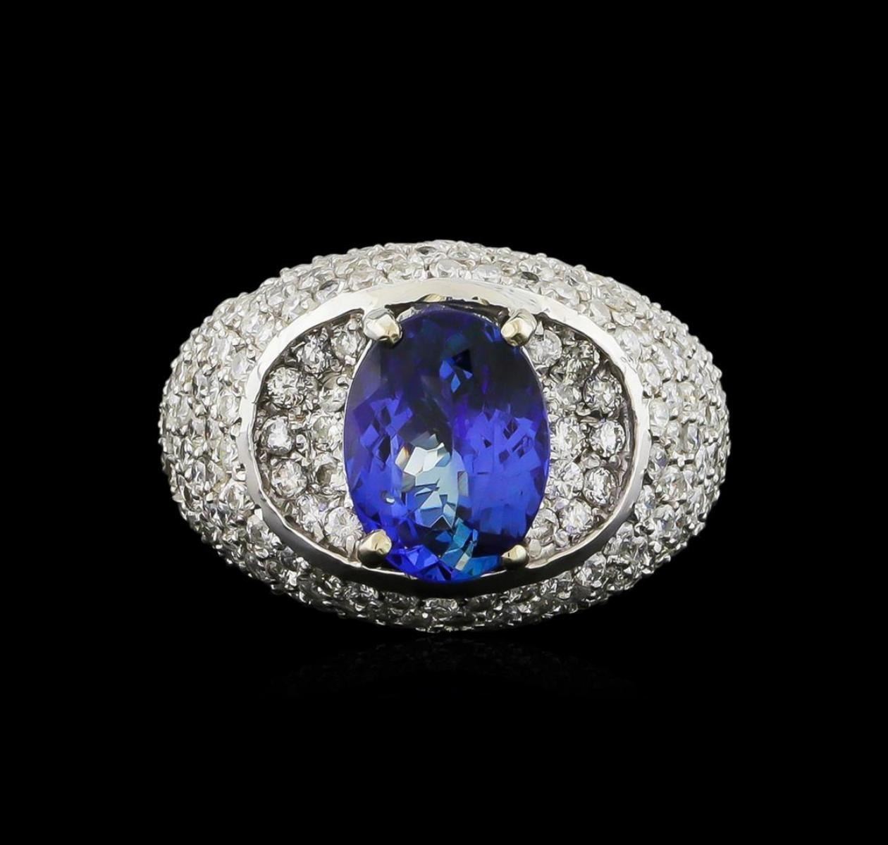 One electronically tested 14KT white gold ladies combination cast & assembled engagement ring with a bright polish finish. Identified with markings of "K14". Condition is new. Containing: One prong set oval modified brilliant cut natural tanzanite, measuring 10.00 x 7.80 x 5.07mm, approximate weight of 2.69ct., clarity is eye clean, type I, medium light, moderately strong, bluish violet color, (GIA bV 4/4), cut is good. One Hundred Sixteen prong set round brilliant cut diamonds, measuring 1.40 - 1.40 x 0.84mm (depth est.) approximate total weight of 116 Stones = 1.16ct. Clarity: SI-1 to I-1. Color: I - J, Cut is Good. Colored gemstones are presumed to have been subjected to commonly used enhancement processes. All diamonds and colored gemstones are graded in the mounting, unless otherwise stated. Total Weight of Colored Stones 2.69ct. Total Weight of Diamonds 1.16ct. Total Weight of Ring 10.00 grams. GGL Appraised.