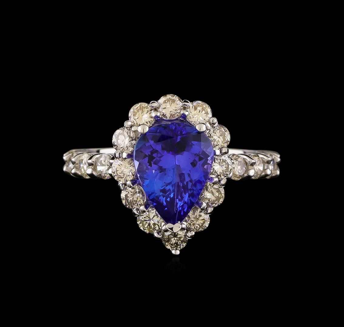 One electronically tested 14KT white gold ladies combination cast & assembled sapphire and diamond ring with a bright polish finish. Identified with markings of "14K". Condition is new. Containing: One prong set pear modified brilliant cut natural tanzanite, measuring 10.59 x 7.65 x 4.97mm, approximate weight of 2.70ct., clarity is eye clean, type I, medium, moderately strong, violet color, (GIA V 5/4), cut is good. Twenty-Two prong set round brilliant cut diamonds, measuring 2.50 - 2.50 x 1.50mm (depth est.) approximate total weight of 22 Stones = 1.26ct. Clarity: SI-2 to I-1. Color: J, Cut is Good. Colored gemstones are presumed to have been subjected to commonly used enhancement processes. All diamonds and colored gemstones are graded in the mounting, unless otherwise stated. Total Weight of Colored Stones 2.70ct. Total Weight of Diamonds 1.26ct. Total Weight of Ring 4.70 grams. GGL Appraised at $6,010.00.