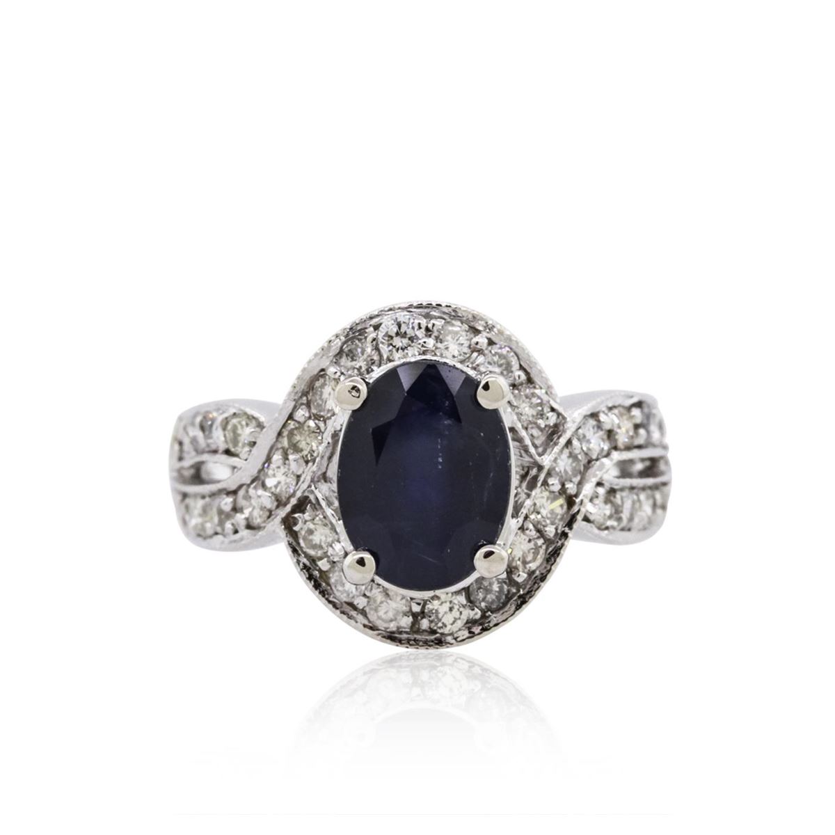 One ring featuring: 14KT white gold weighing 6.90 grams containing one prong set oval cut sapphire with a total weight of 2.70ct and pave set round cut diamonds with a total weight of 0.75cts.