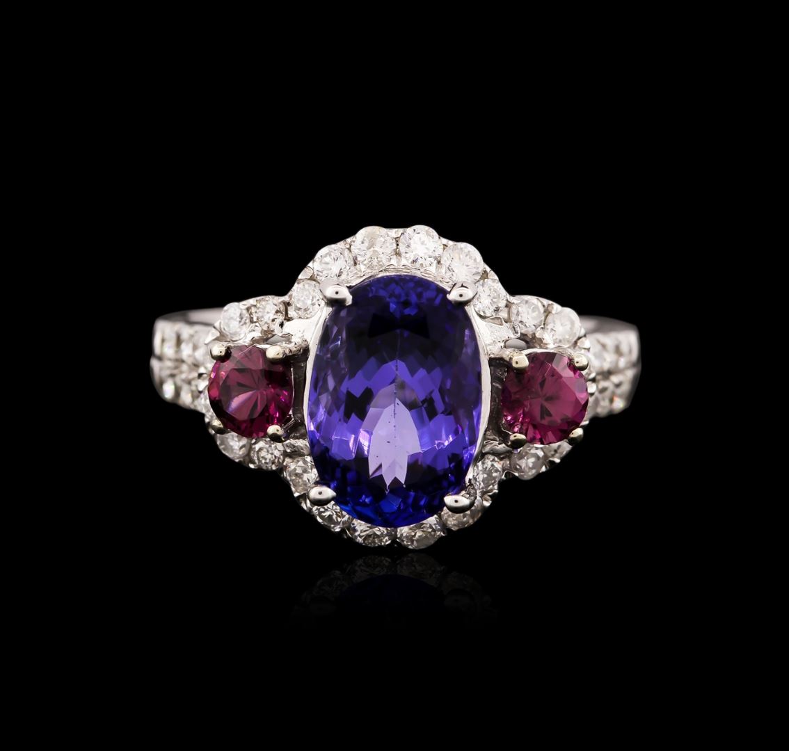 One electronically tested 14KT white gold ladies cast tanzanite, tourmaline and diamond ring with a bright polish finish. Identified with markings of "14K". Condition is new. Containing: One prong set oval modified brilliant cut natural tanzanite, measuring 10.44 x 7.09 x 5.18mm, approximate weight of 2.70ct., clarity is eye clean, type I, medium, moderately strong, violet color, (GIA V 5/4), cut is good. One prong set round modified brilliant cut natural pink tourmaline, measuring 4.00 - 4.00 x 2.60 mm, approximate weight of 0.34ct., clarity is slightly included, medium, very slightly grayish, reddish purple color, (GIA rP 5/3), cut is good. Thirty-Six prong set round brilliant cut diamonds, measuring 1.50 - 1.50 x 0.90mm (depth est.) approximate total weight of 36 Stones = 0.44ct. Clarity: I-1 to I-2. Color: I - J. Colored gemstones are presumed to have been subjected to commonly used enhancement processes. All diamonds and colored gemstones are graded in the mounting, unless otherwise stated. Total Weight of Colored Stones 3.04ct. Total Weight of Diamonds 0.44ct. Total Weight of Ring 5.60 grams. GGL Appraised at $4,145.00.