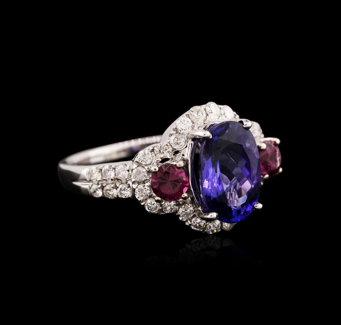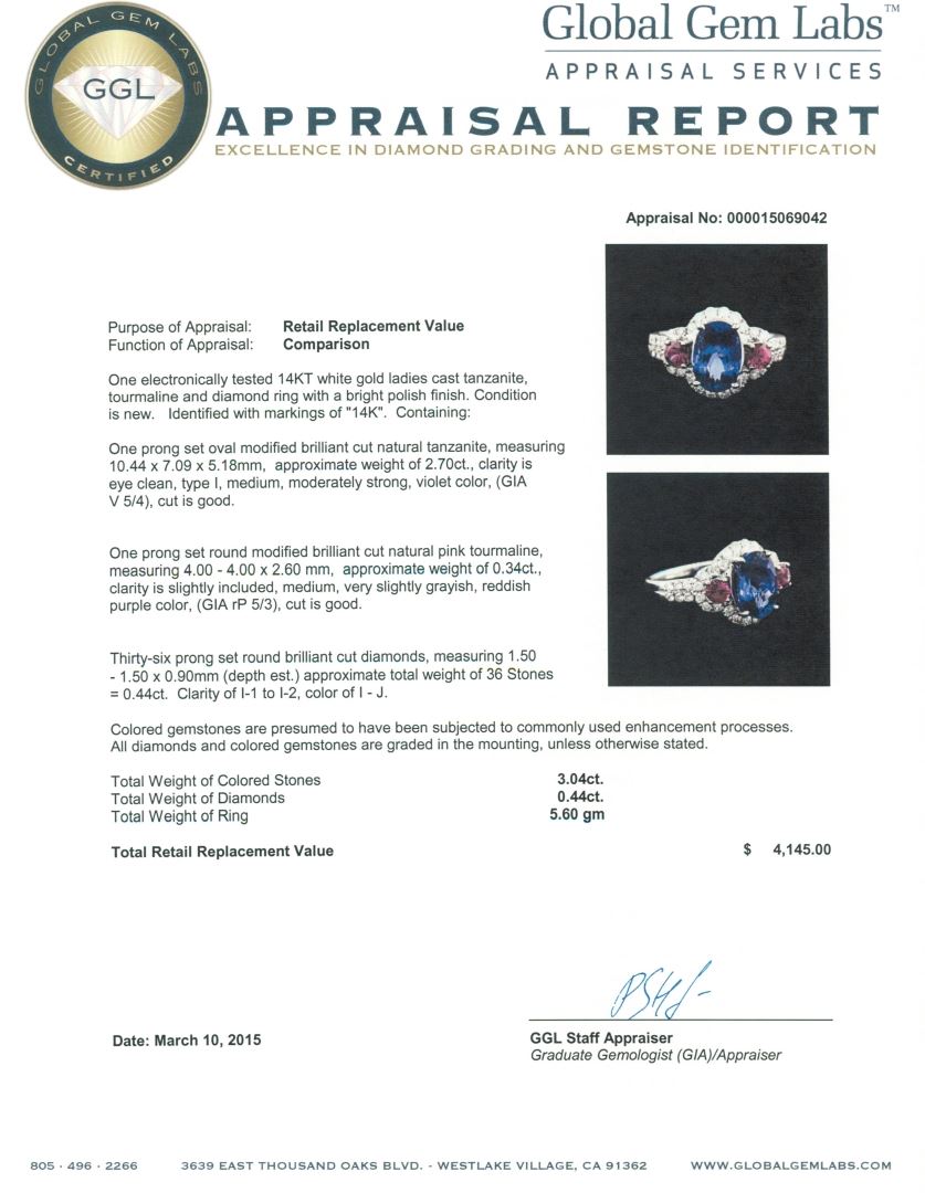 One electronically tested 14KT white gold ladies cast tanzanite, tourmaline and diamond ring with a bright polish finish. Identified with markings of "14K". Condition is new. Containing: One prong set oval modified brilliant cut natural tanzanite, measuring 10.44 x 7.09 x 5.18mm, approximate weight of 2.70ct., clarity is eye clean, type I, medium, moderately strong, violet color, (GIA V 5/4), cut is good. One prong set round modified brilliant cut natural pink tourmaline, measuring 4.00 - 4.00 x 2.60 mm, approximate weight of 0.34ct., clarity is slightly included, medium, very slightly grayish, reddish purple color, (GIA rP 5/3), cut is good. Thirty-Six prong set round brilliant cut diamonds, measuring 1.50 - 1.50 x 0.90mm (depth est.) approximate total weight of 36 Stones = 0.44ct. Clarity: I-1 to I-2. Color: I - J. Colored gemstones are presumed to have been subjected to commonly used enhancement processes. All diamonds and colored gemstones are graded in the mounting, unless otherwise stated. Total Weight of Colored Stones 3.04ct. Total Weight of Diamonds 0.44ct. Total Weight of Ring 5.60 grams. GGL Appraised at $4,145.00.