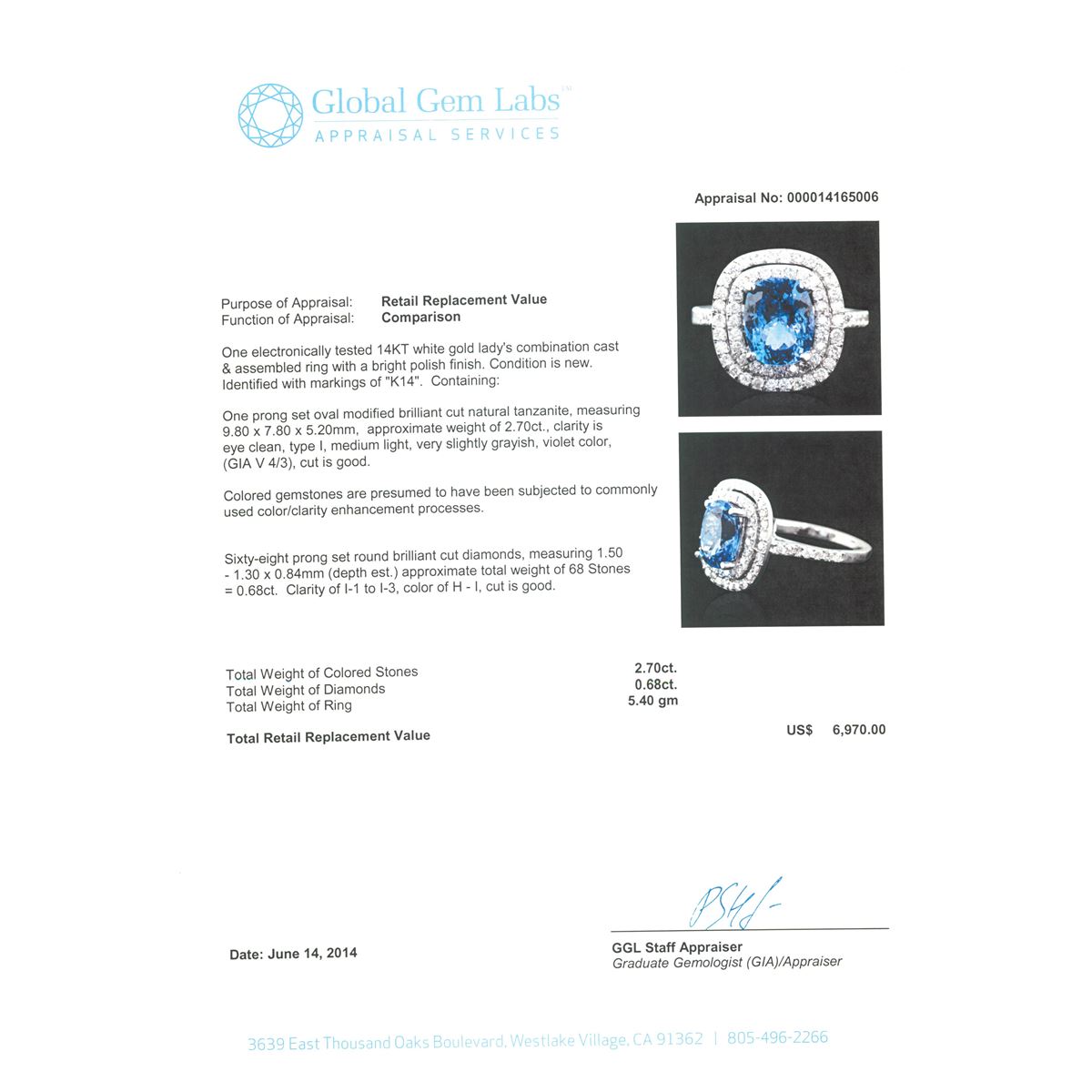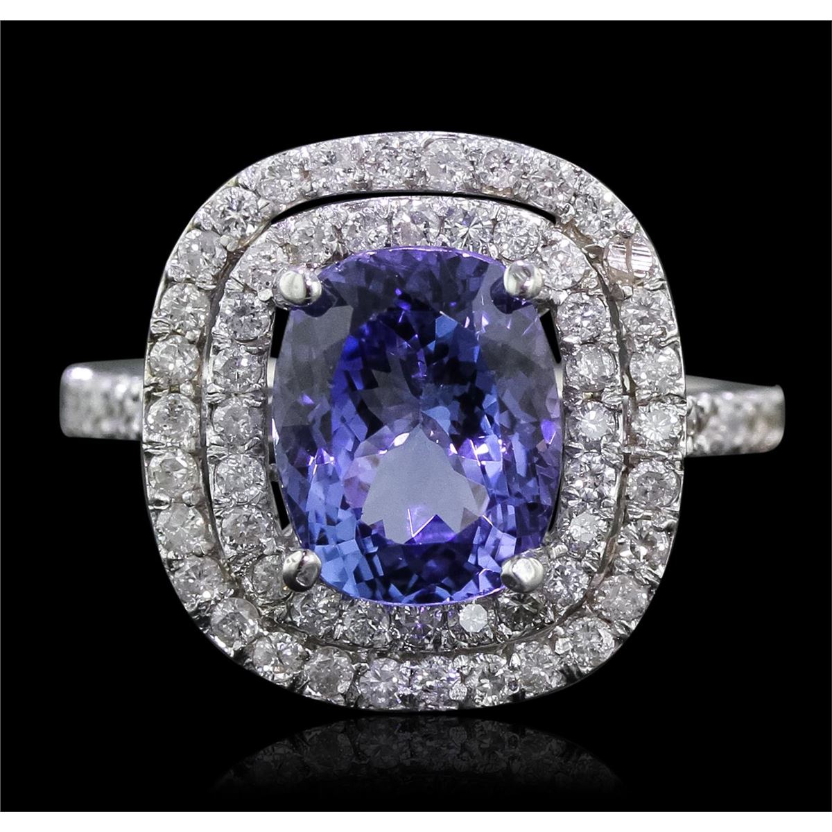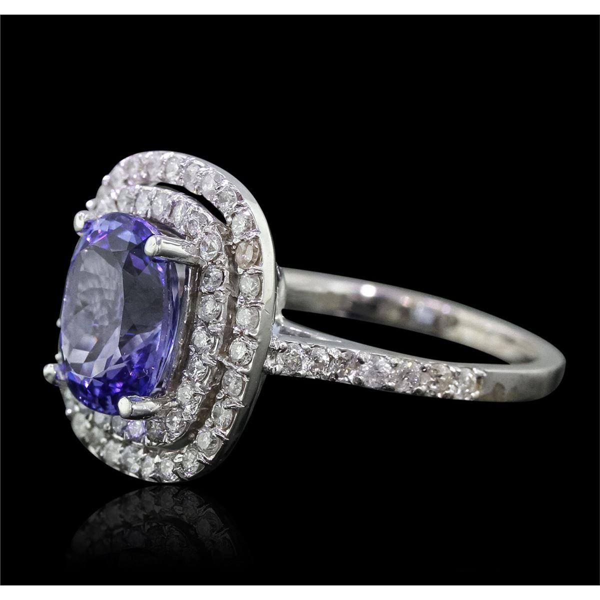 One electronically tested 14KT white gold Ladies combination cast & assembled ring with a bright polish finish. Condition is new. Identified with markings of "K14". Containing: One prong set oval modified brilliant cut natural tanzanite, measuring 9.80 x 7.80 x 5.20mm, approximate weight of 2.70ct., clarity is eye clean, type I, medium light, very slightly grayish, violet color, (GIA V 4/3), cut is good. Colored gemstones are presumed to have been subjected to commonly used color/clarity enhancement processes. Sixty-Eight prong set round brilliant cut diamonds, measuring 1.50 - 1.30 x 0.84mm (depth est.) approximate. Total Weight of 68 Stones = 0.68ct. Clarity: I-1 to I-3. Color: H - I, Cut is Good. Total Weight of Colored Stones 2.70ct. Total Weight of Diamonds 0.68ct. Total Weight of Ring 5.40 grams. GGL Appraised at $6,970.00.