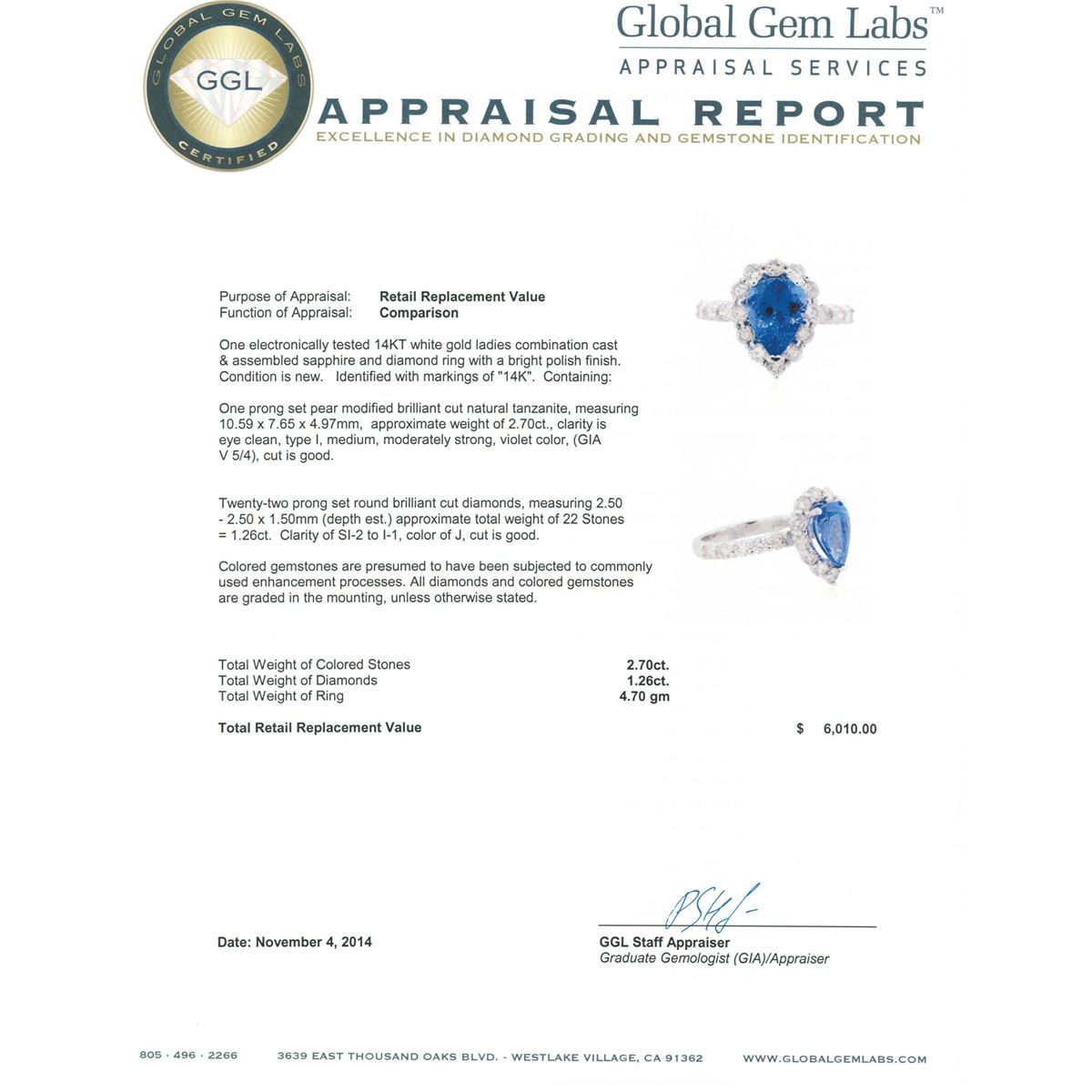 One electronically tested 14KT white gold ladies combination cast & assembled sapphire and diamond ring with a bright polish finish. Identified with markings of "14K". Condition is new. Containing: One prong set pear modified brilliant cut natural tanzanite, measuring 10.59 x 7.65 x 4.97mm, approximate weight of 2.70ct., clarity is eye clean, type I, medium, moderately strong, violet color, (GIA V 5/4), cut is good. Twenty-Two prong set round brilliant cut diamonds, measuring 2.50 - 2.50 x 1.50mm (depth est.) approximate total weight of 22 Stones = 1.26ct. Clarity: SI-2 to I-1. Color: J, Cut is Good. Colored gemstones are presumed to have been subjected to commonly used enhancement processes. All diamonds and colored gemstones are graded in the mounting, unless otherwise stated. Total Weight of Colored Stones 2.70ct. Total Weight of Diamonds 1.26ct. Total Weight of Ring 4.70 grams. GGL Appraised at $6,010.00.