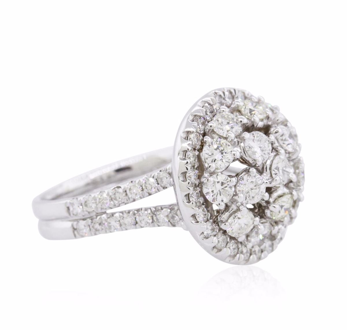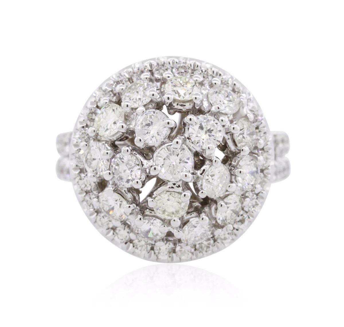 One electronically tested 14KT white gold ladies combination cast & assembled diamond ring with a split shank with a bright polish finish. Identified with markings of K14. Condition is new. Containing: Fifty-Four prong set round brilliant cut diamonds, measuring 1.50 - 1.50 x 0.90mm (depth est.) approximate total weight of 54 Stones = 0.66ct. Clarity: SI-2 to I-1. Color: I - J, Cut is Good. Seventeen prong set round brilliant cut diamonds, measuring 3.20 - 3.20 x 1.92mm (depth est.) approximate total weight of 17 Stones = 2.04ct. Clarity: I-1. Color: I - J, Cut is Good. All diamonds are graded in the mounting, unless otherwise stated. Total Weight of Diamonds 2.70ct. Total Weight of Ring 8.10 grams. GGL Appraised at $7,225.00.